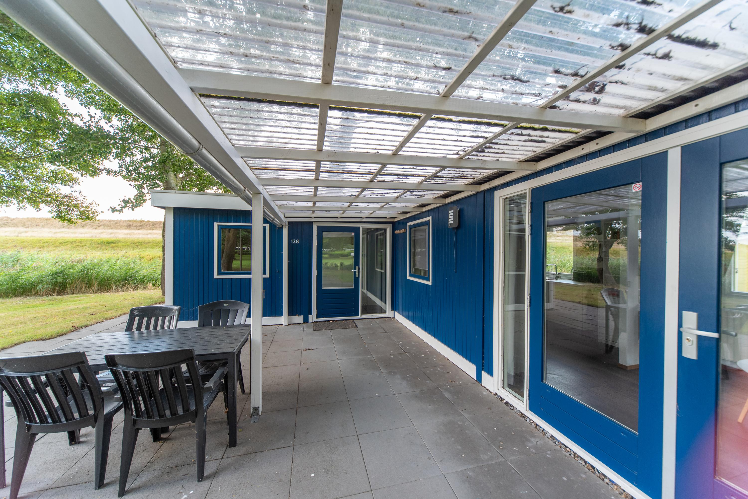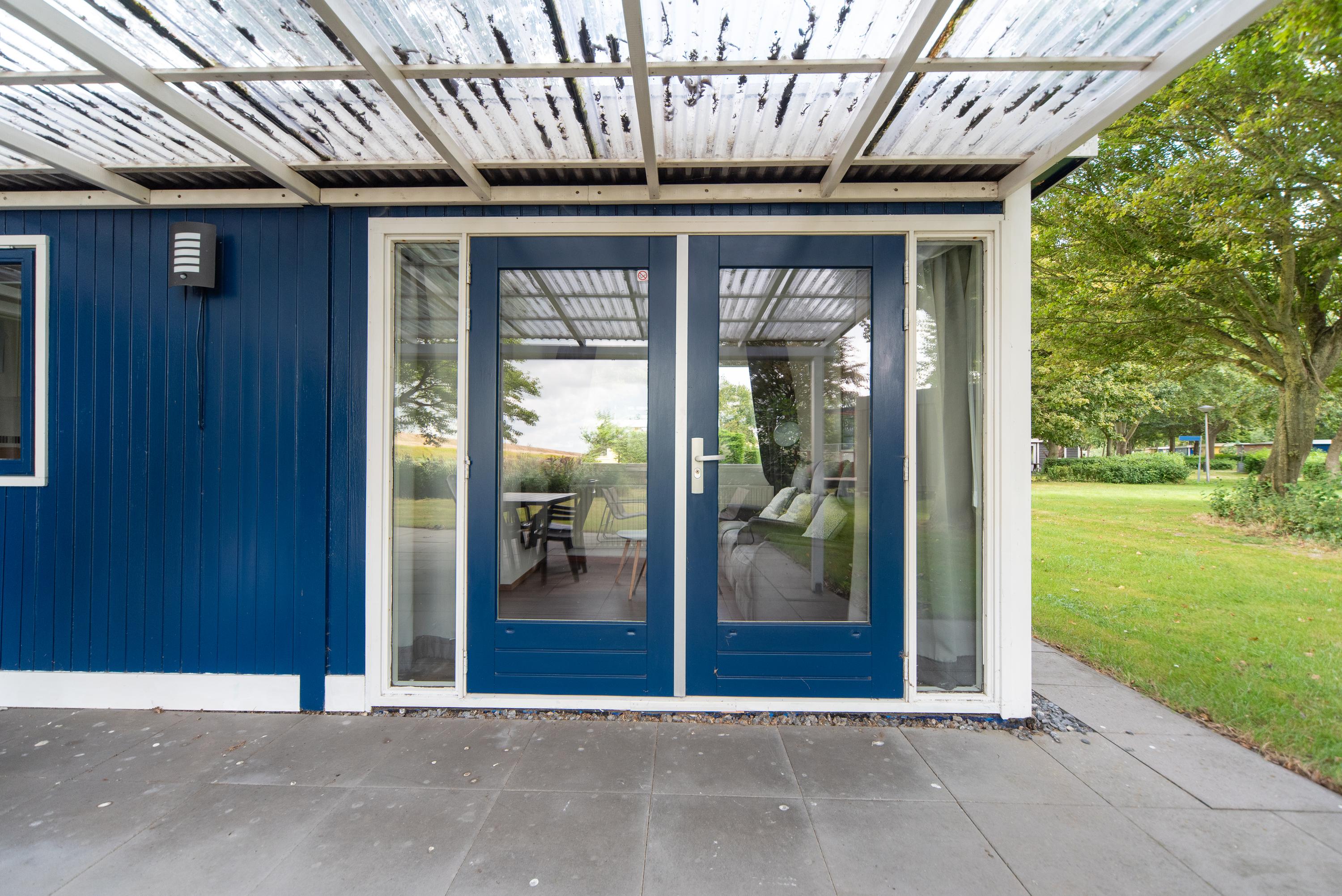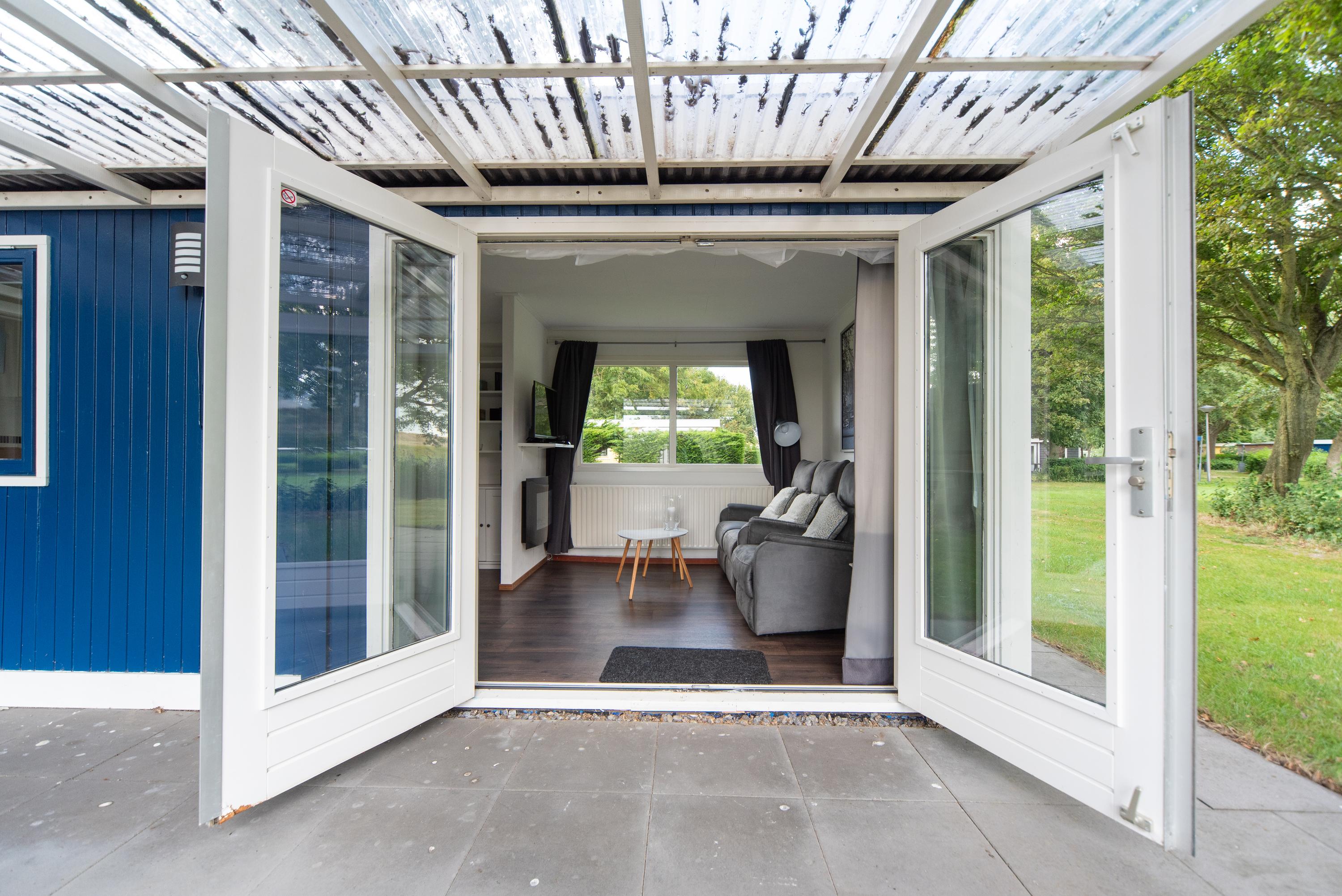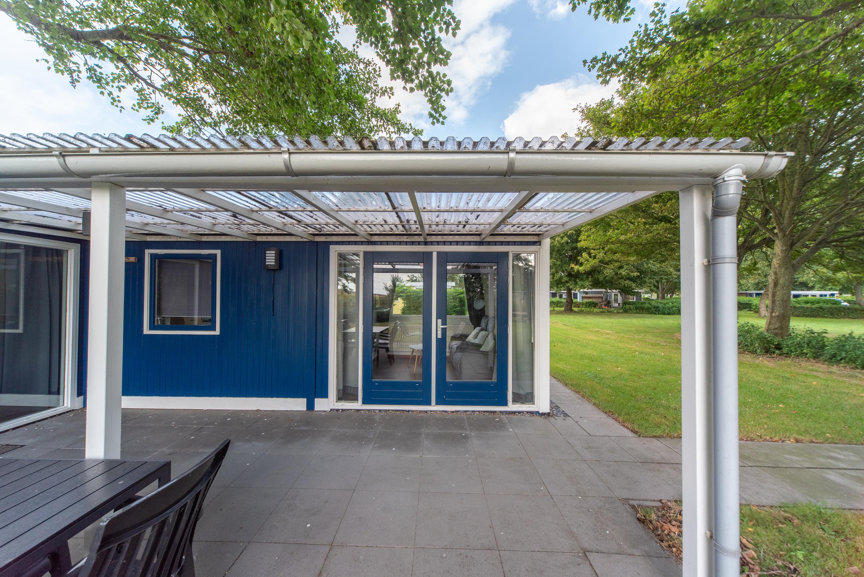 Aan de zijkant bevindt zich over de gehele lengte van het chalet een overkapping boven het betegelde terras, de openslaande deuren en de voordeur. Erg makkelijk als u met volle boodschappentassen tijdens een plotselinge regenbui uw sleutels nog moet zoeken om de voordeur open te maken of een mogelijkheid om toch het wasrek nog even buiten weg te zetten als het onverhoopt gaat regenen.