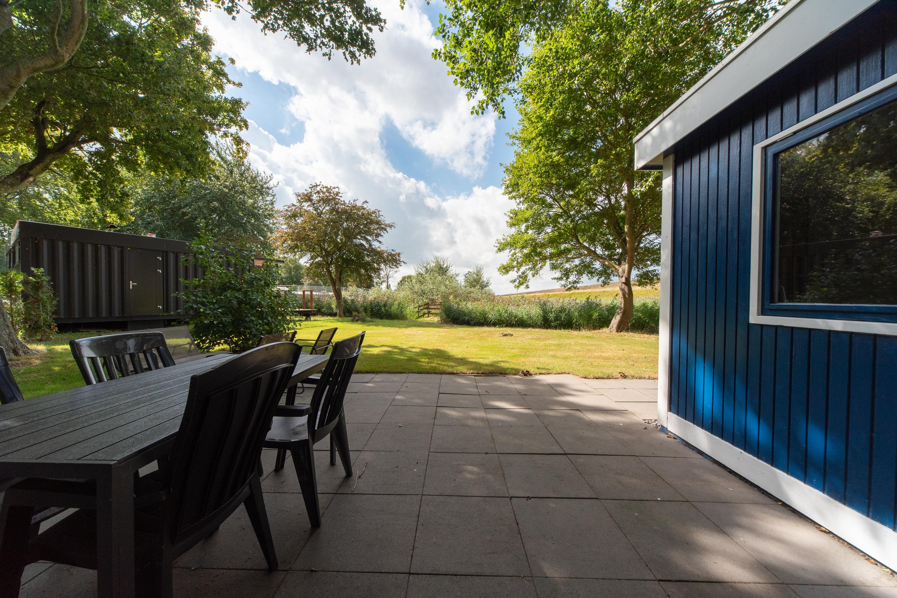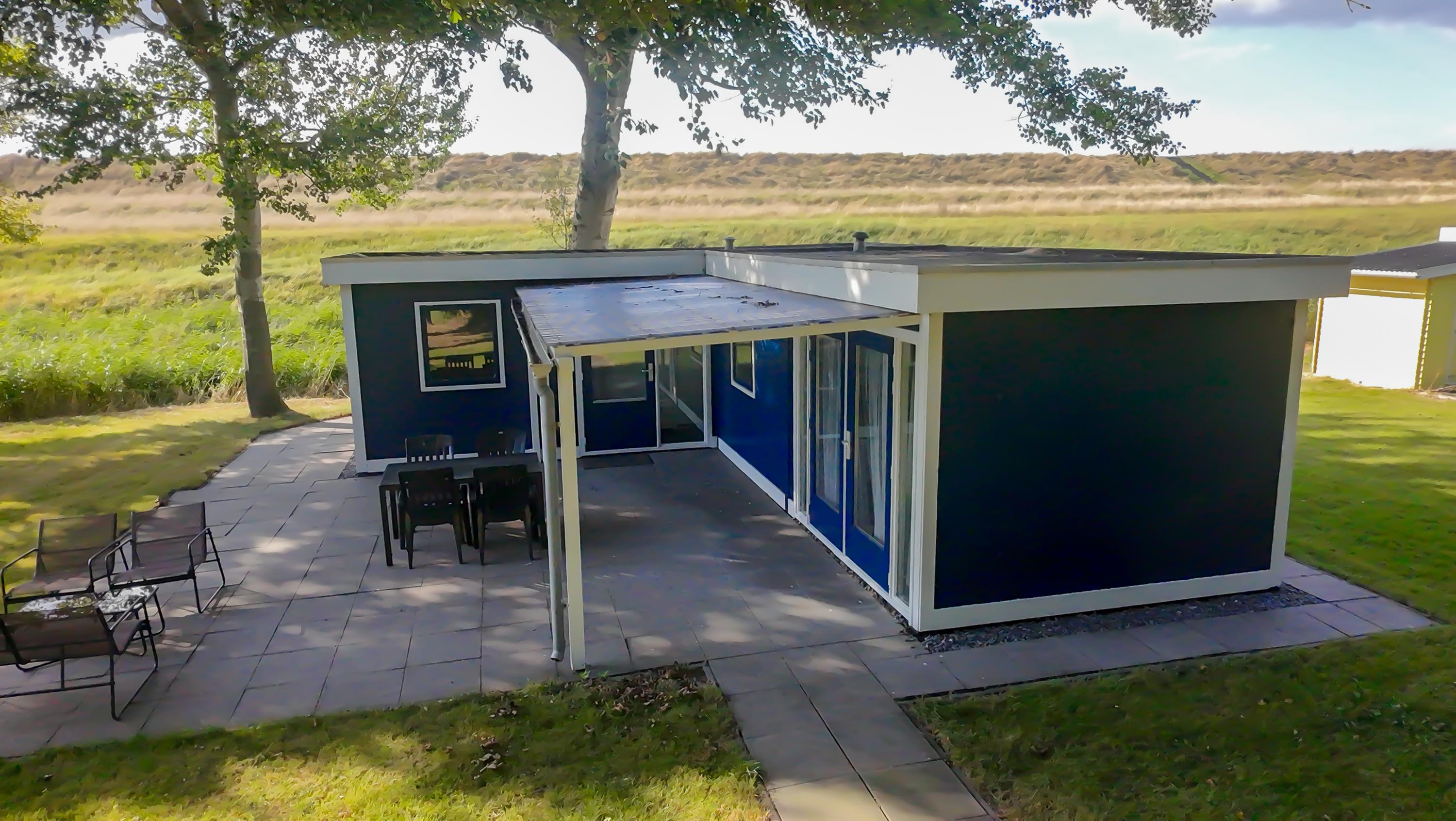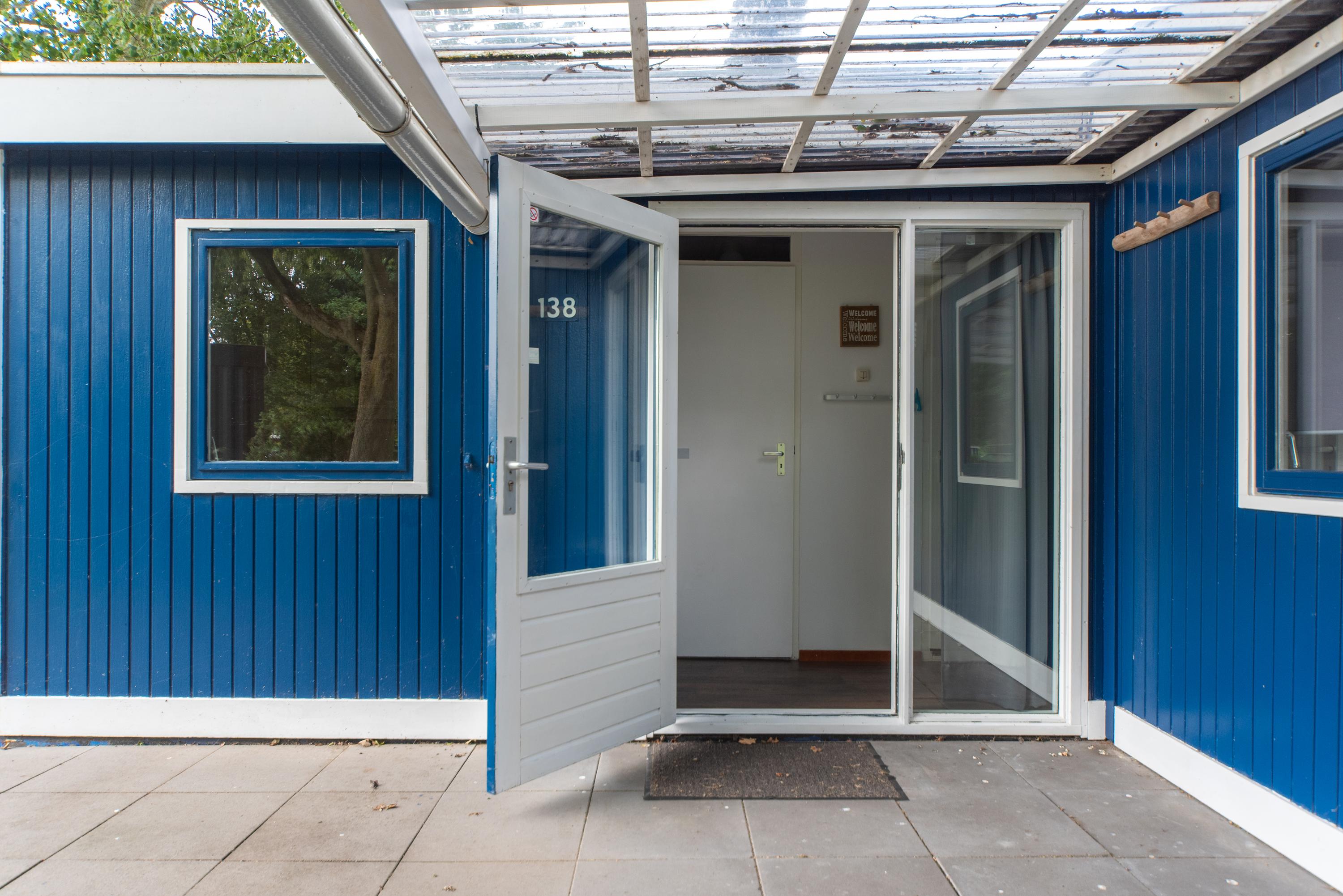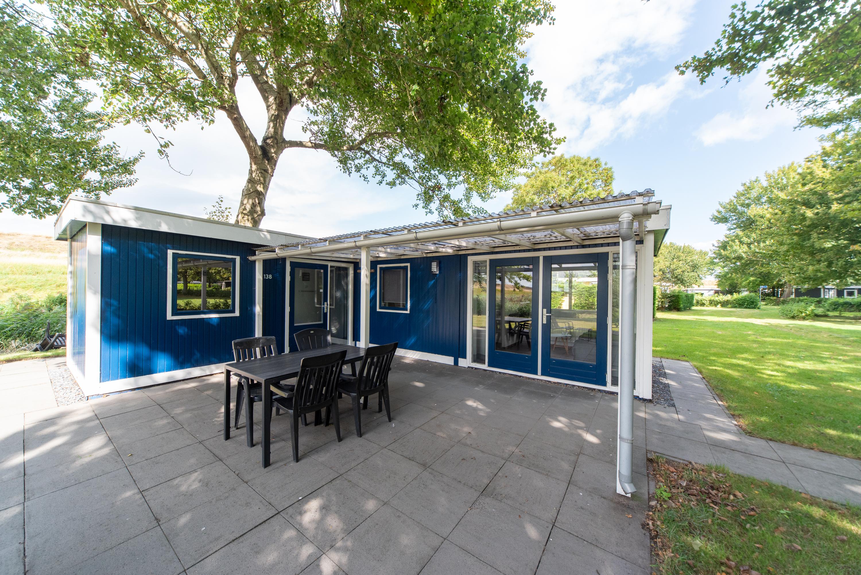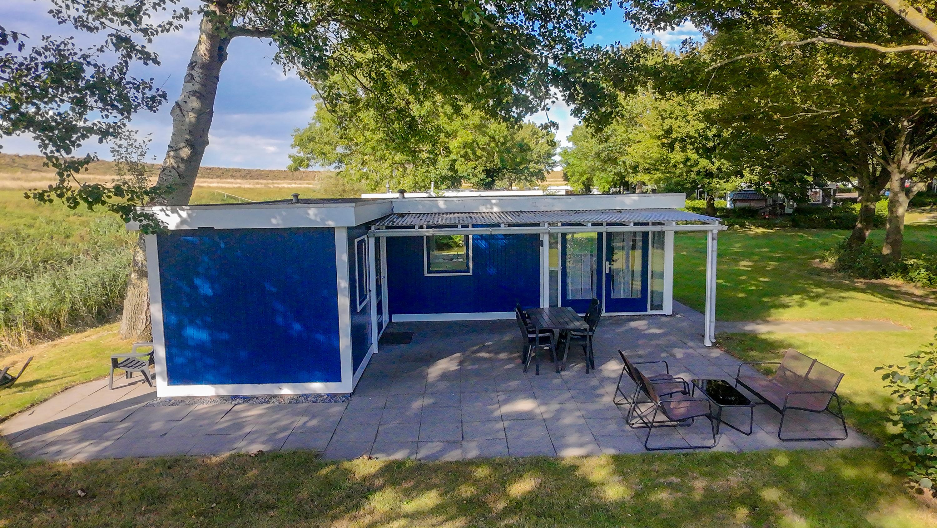 Aan de zijkant bevindt zich over de gehele lengte van het chalet een overkapping boven het betegelde terras, de openslaande deuren en de voordeur. Erg makkelijk als u met volle boodschappentassen tijdens een plotselinge regenbui uw sleutels nog moet zoeken om de voordeur open te maken of een mogelijkheid om toch het wasrek nog even buiten weg te zetten als het onverhoopt gaat regenen.