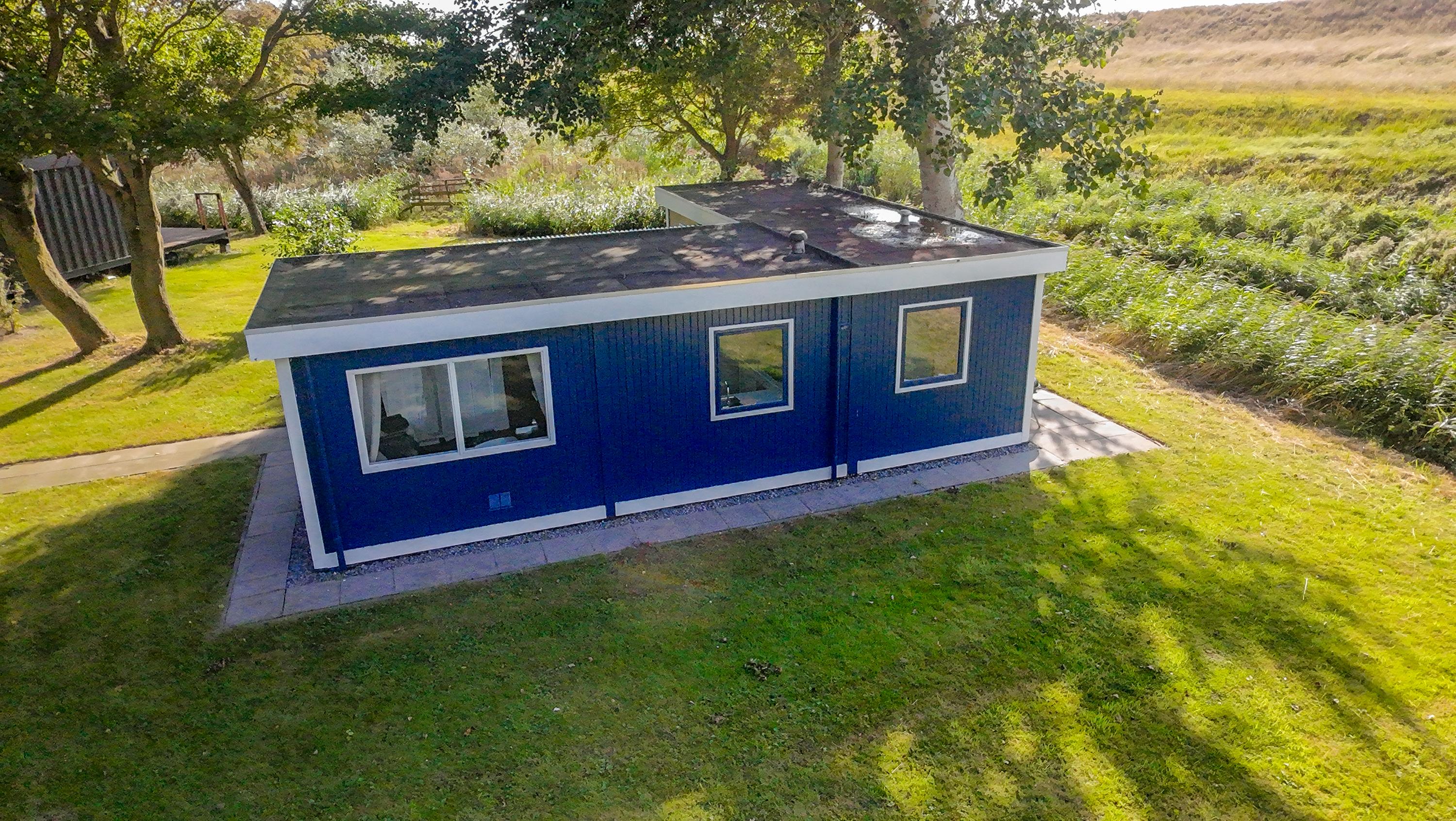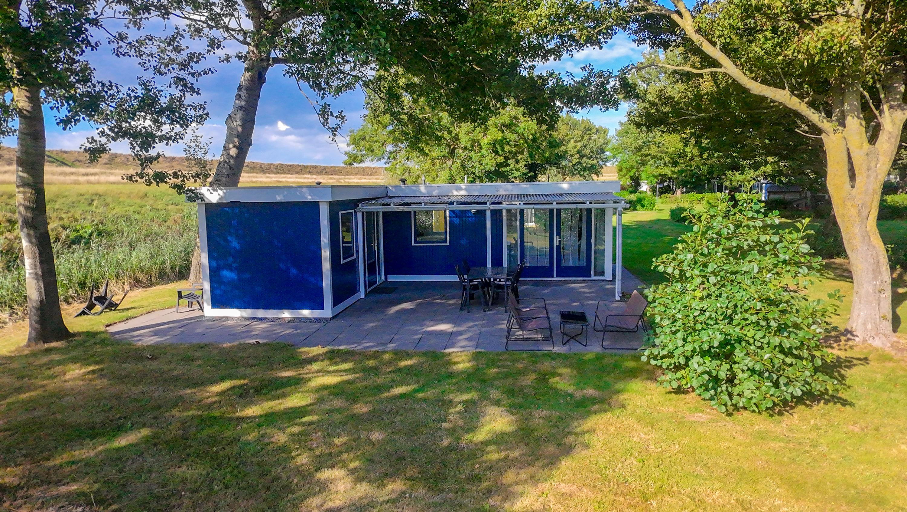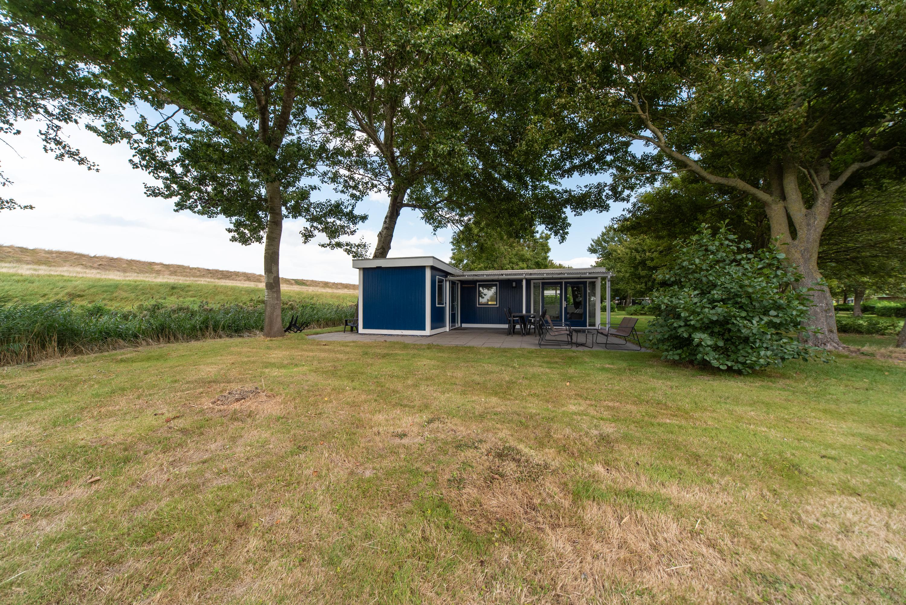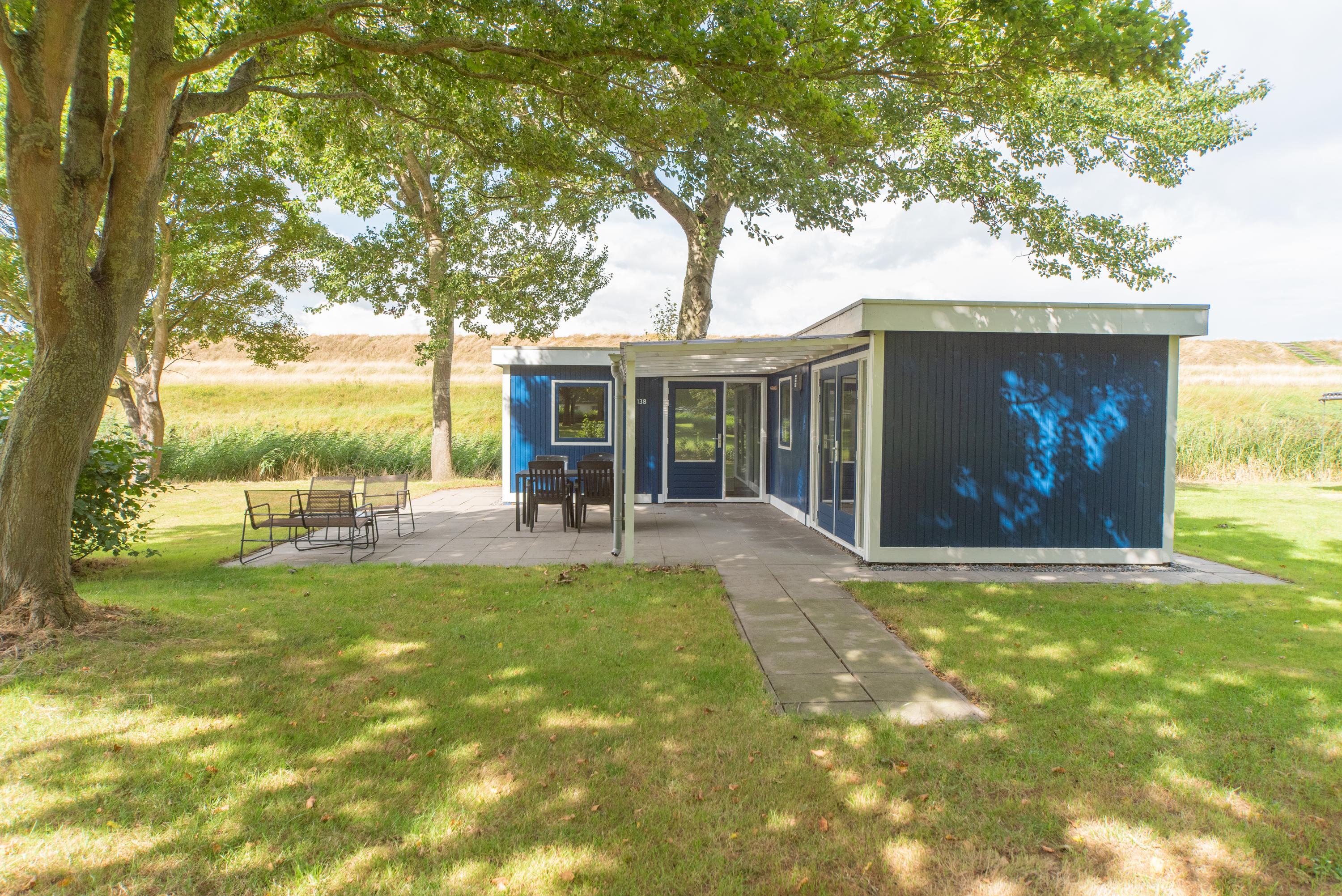Aan de zijkant bevindt zich over de gehele lengte van het chalet een overkapping boven het betegelde terras, de openslaande deuren en de voordeur. Erg makkelijk als u met volle boodschappentassen tijdens een plotselinge regenbui uw sleutels nog moet zoeken om de voordeur open te maken of een mogelijkheid om toch het wasrek nog even buiten weg te zetten als het onverhoopt gaat regenen.
