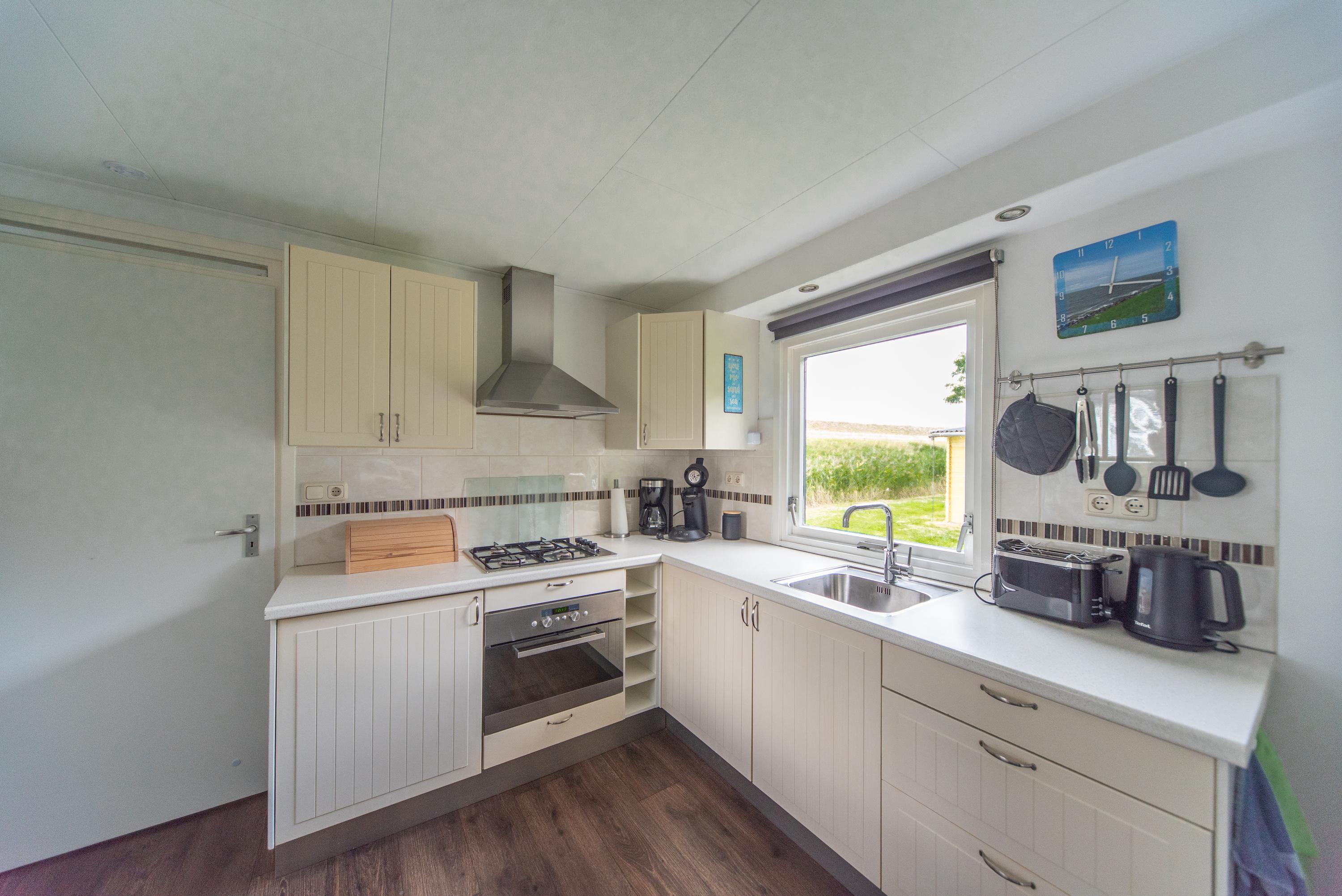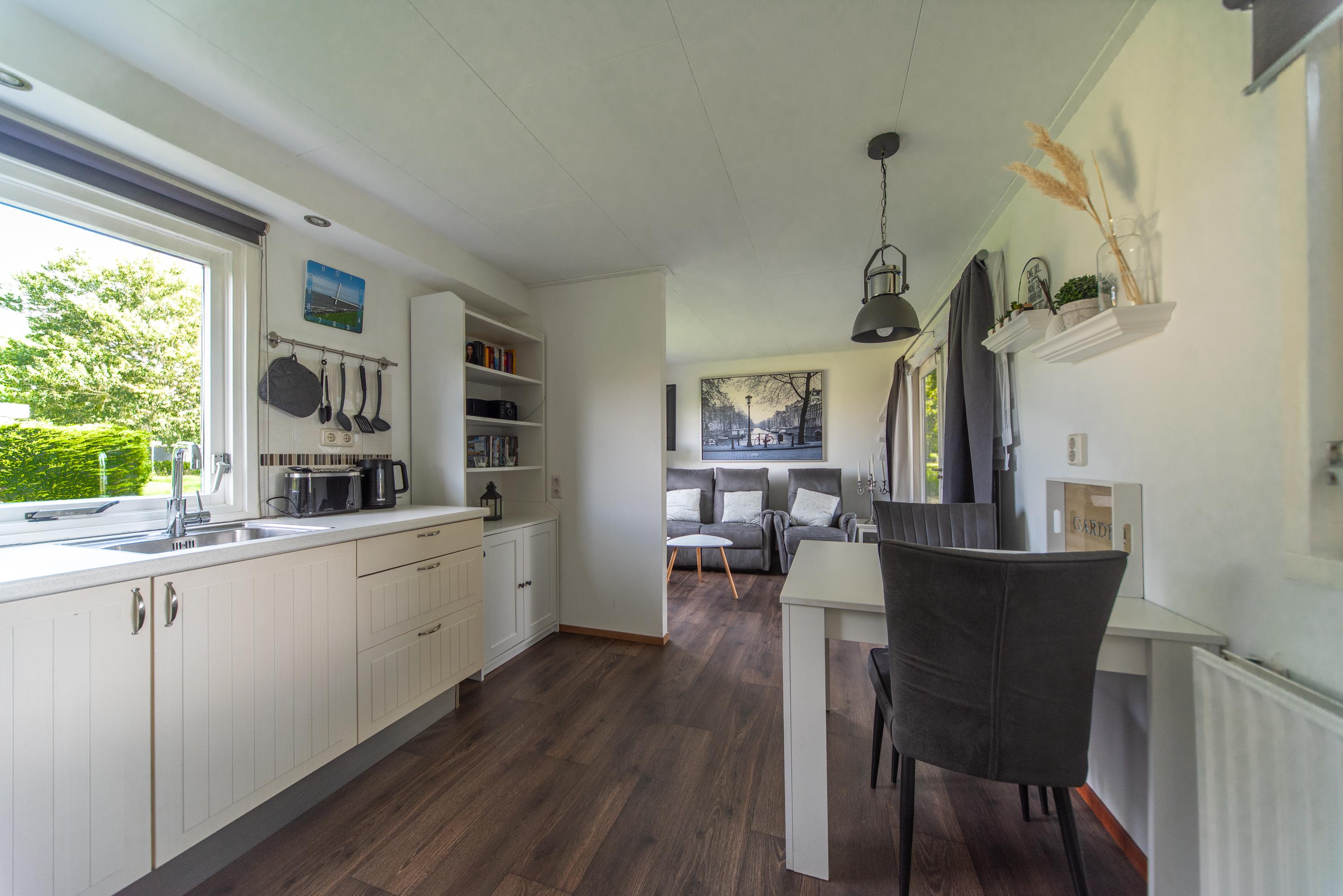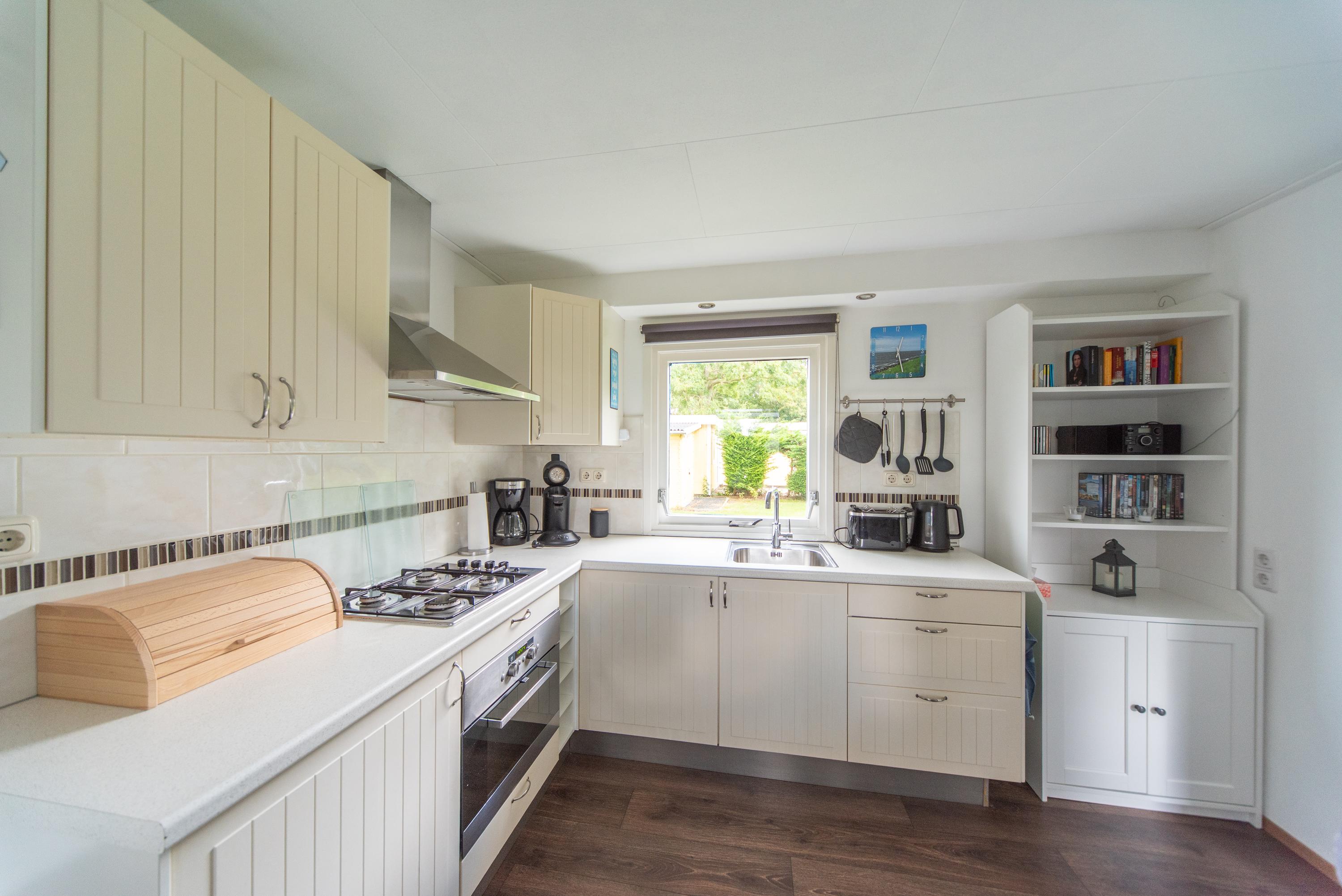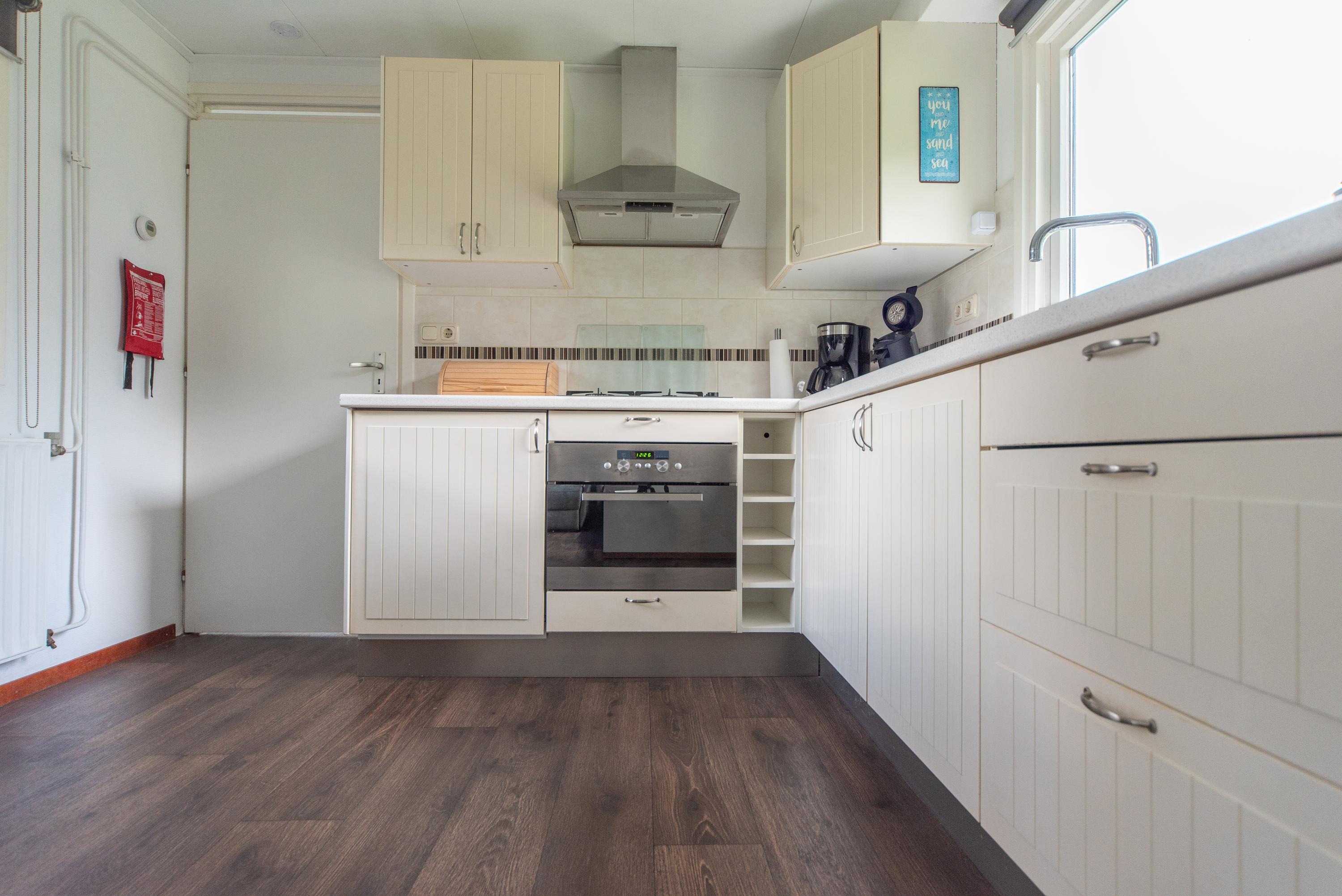 De keuken is van alle gemakken voorzien zoals een (compacte) vaatwasser, gaskookplaat, afzuigkap, oven en zelfs aan de klein huishoudelijke apparaten is gedacht. Zo vindt u hier onder meer een koffiezetapparaat, waterkoker en broodrooster. De keuken is uitgevoerd in een tijdloze witte kleur die nog jaren mee kan. Op de vloer zien we een contrasterende donkere houten laminaatvloer die prima onderhouden is en makkelijk schoon te maken is.