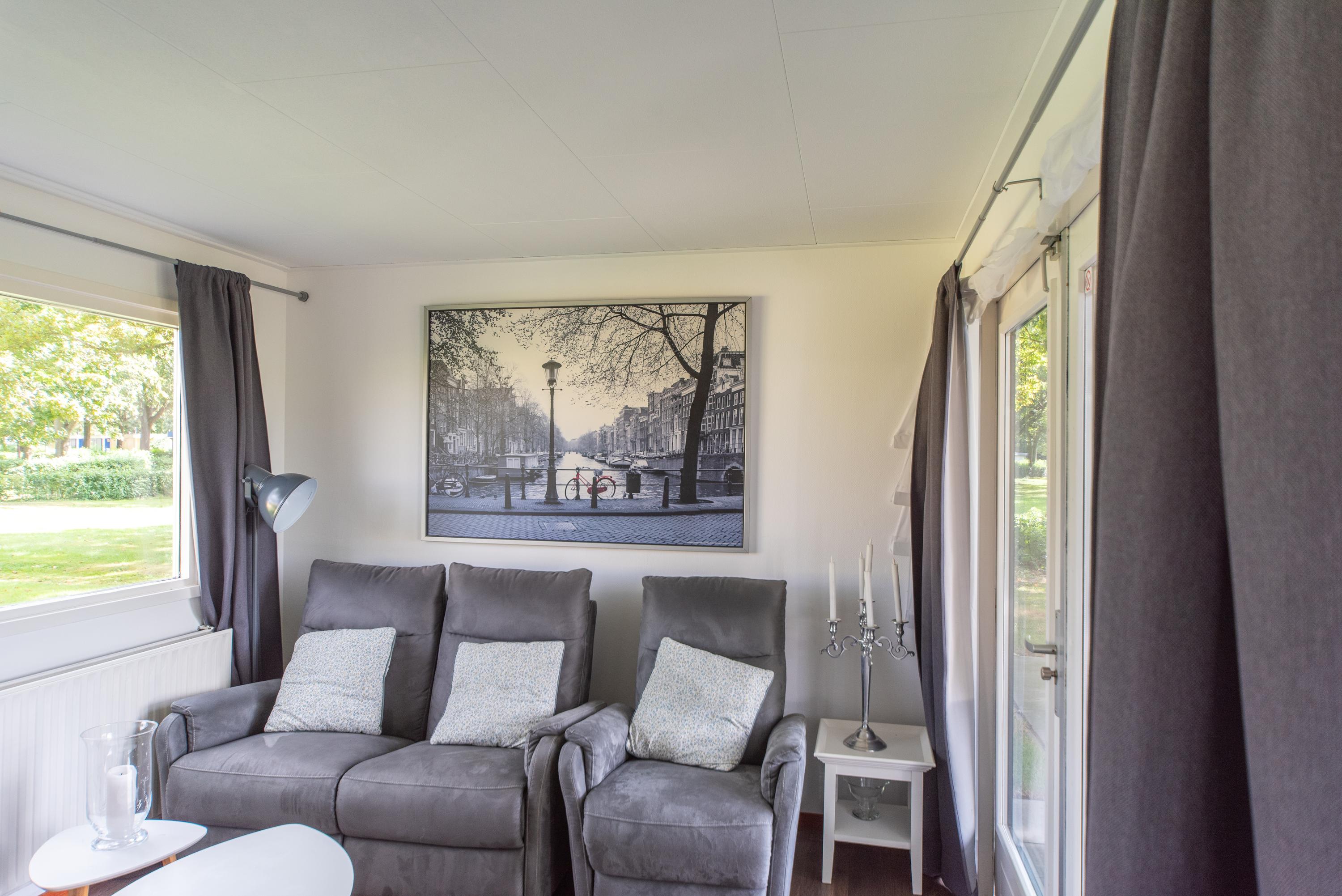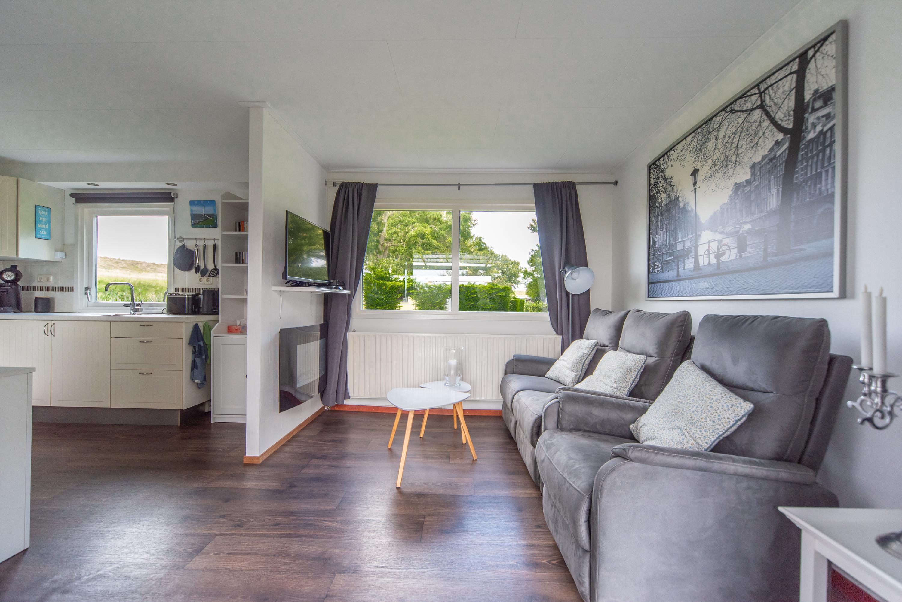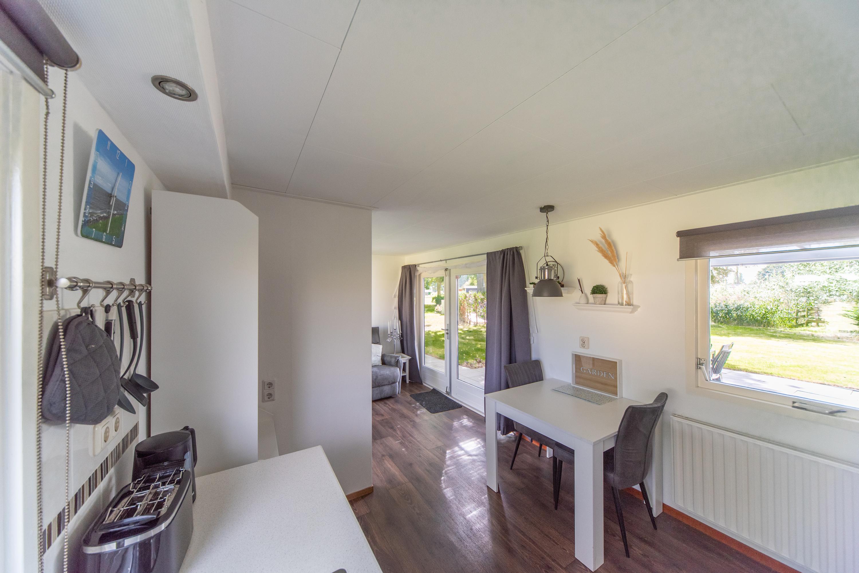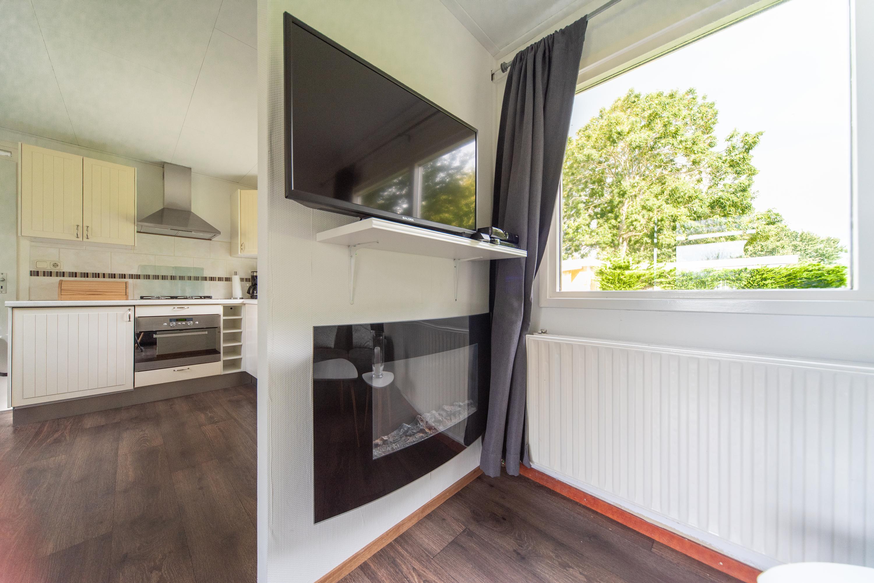 De huidige bewoners laten het chalet zoals gezegd volledig gemeubileerd achter, dus ook het recent gekochte bankstel en de stoel die beide voorzien zijn van elektrisch ingebouwde voetensteun blijven net als de TV en sierhaard gewoon achter in de woonkamer die zeker voor een chalet, mooi van formaat is. De woonkamer heeft ook nog 2 openslaande deuren naar het overdekte zonneterras, waar u ook heerlijk kunt vertoeven aan de kunststof tuin set of languit onderuit kunt op de lounge set die aanwezig is.