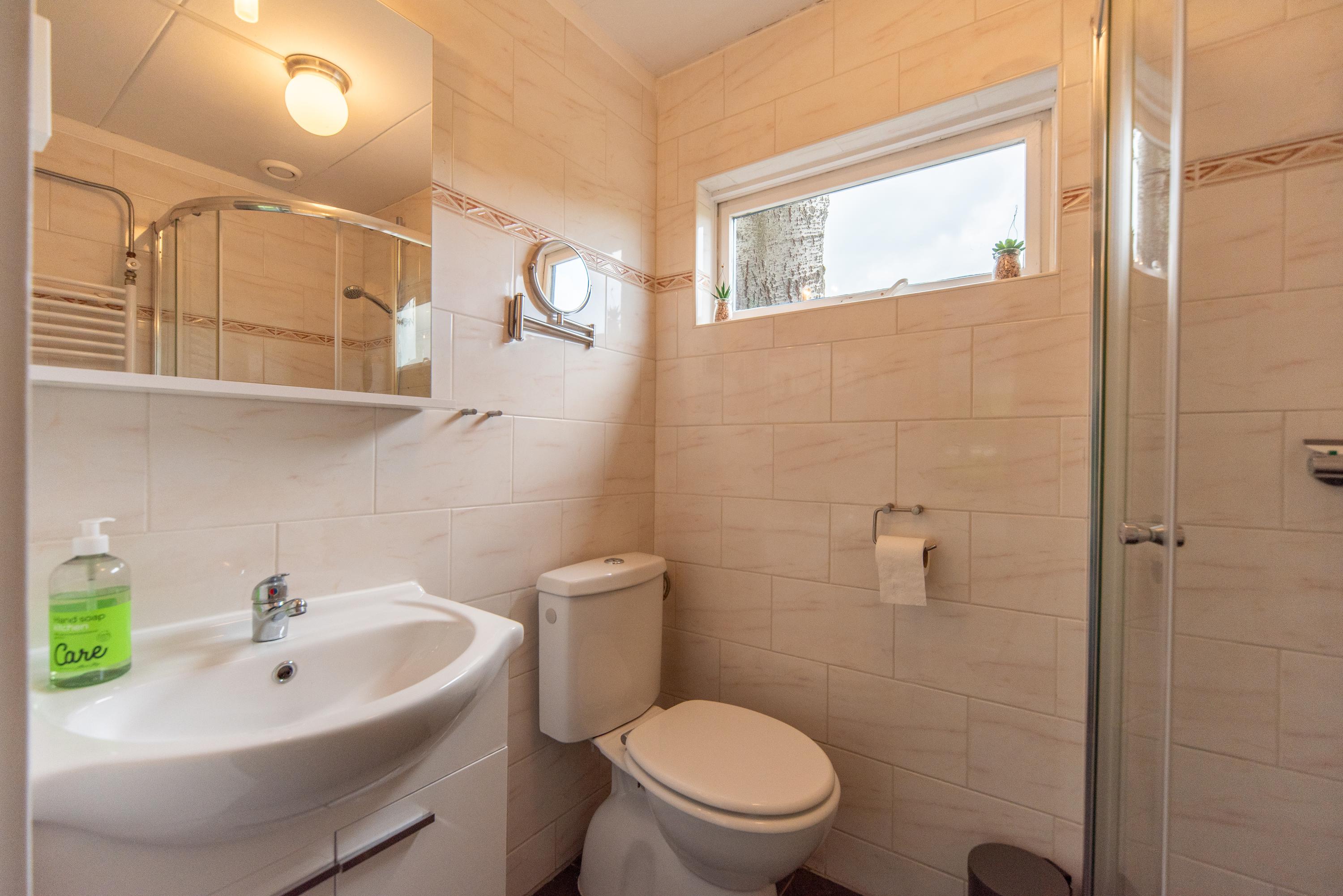 De hal biedt ook toegang tot de bergruimte waar de CV-combiketel nu hangt, maar deze ruimte zou u ook kunnen gebruiken om bijvoorbeeld een wasmachine te plaatsen. De badkamer is prima van formaat en is voorzien van een douche, toilet, badkamer meubel met wasbak. spiegel en planchet en zelfs hier hangt een radiator waar u uw handdoek op kunt drogen na het douchen.