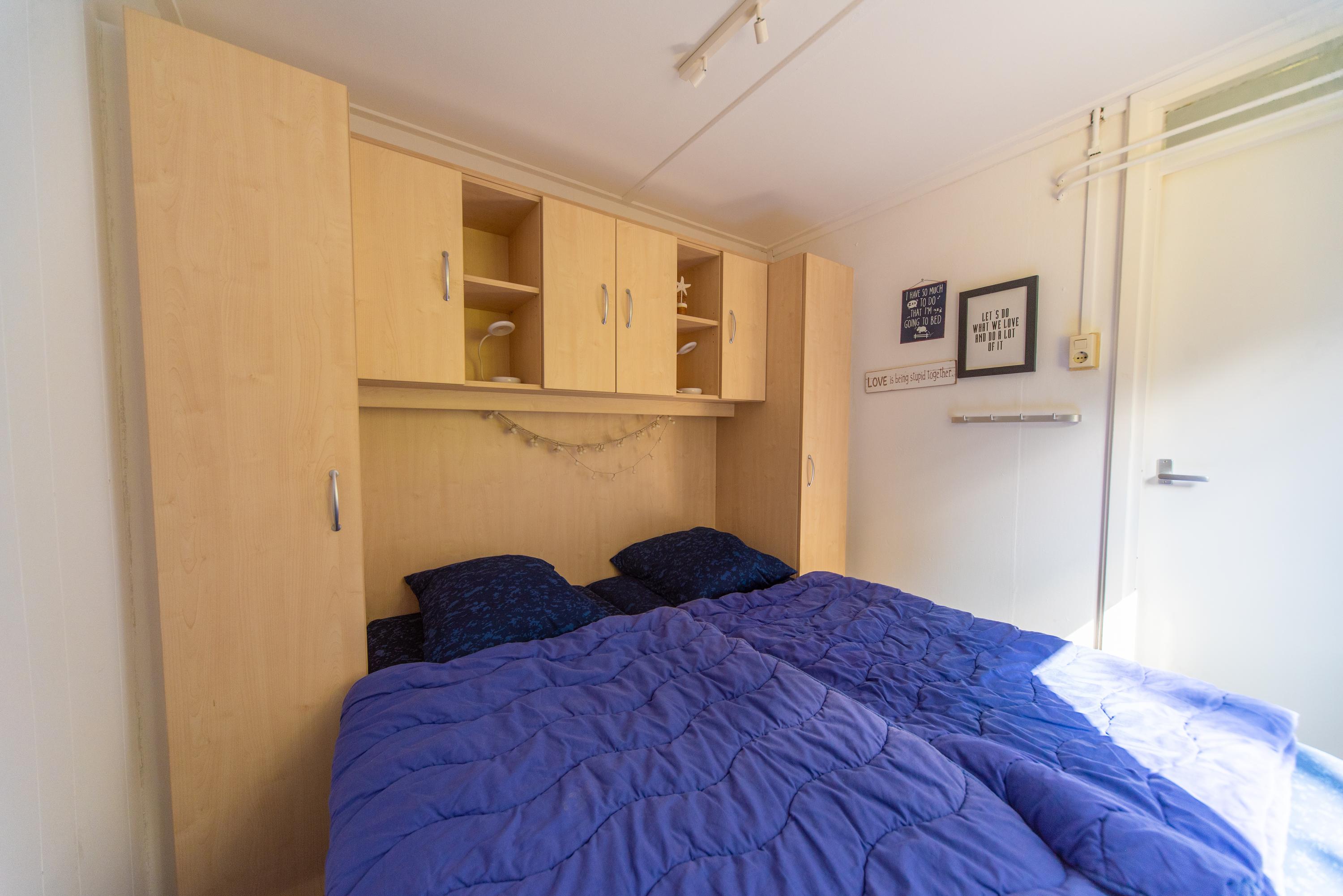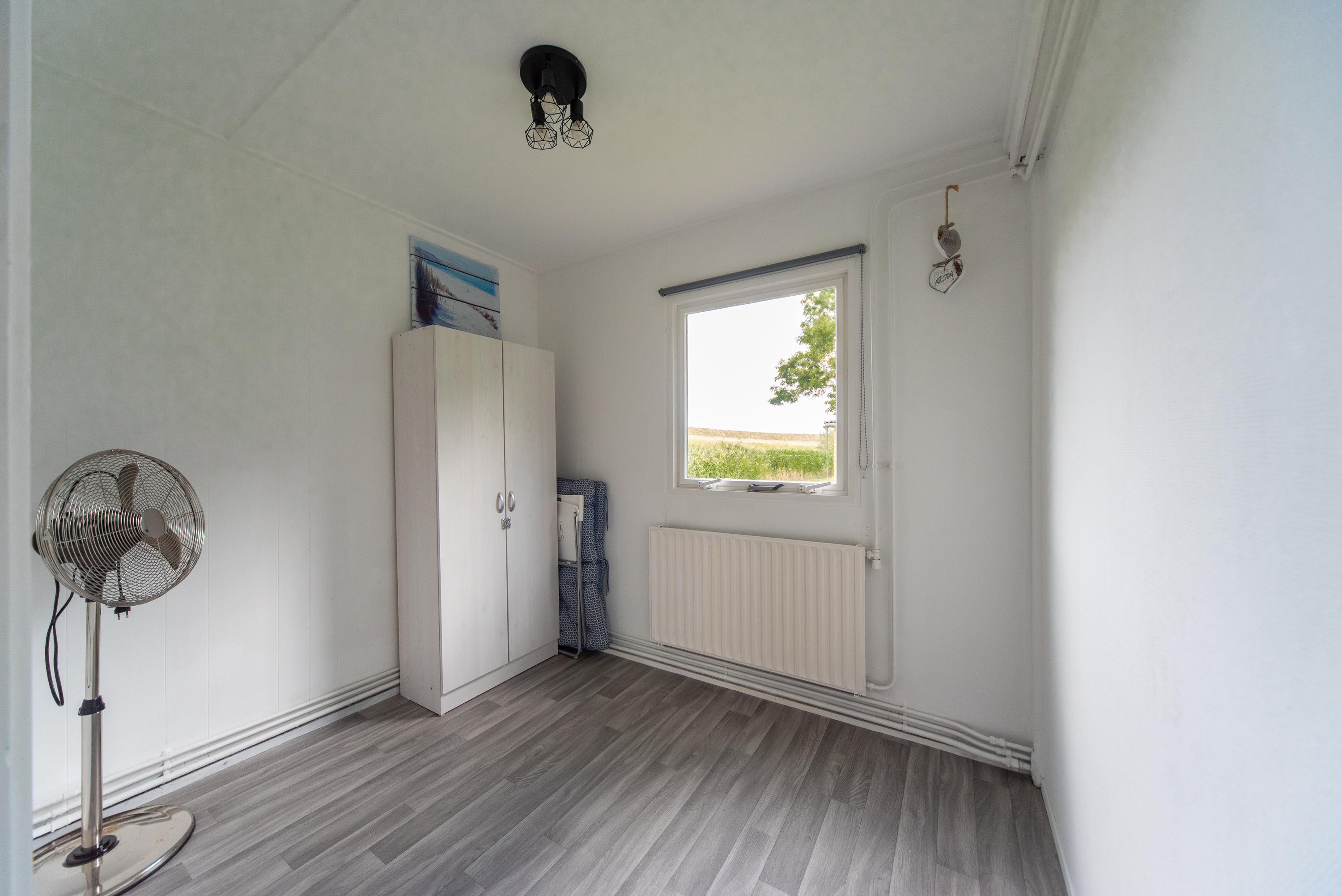 Als we binnenkomen in de hal valt gelijk het natuurlijke zonlicht op wat door het grote raam naast de voordeur naar binnenkomt. De centraal gelegen hal biedt toegang tot 2 slaapkamers van verschillend formaat, waarbij er in de grote slaapkamer een 2 persoons bed met kastombouw voor u klaar staat waar u nog de nodige spulletjes in kunt opbergen. De tweede slaapkamer is momenteel nagenoeg leeg, maar u zou hier prima een stapelbed in kunnen plaatsen, zodat u hier met 4 personen heerlijk kunt verblijven.