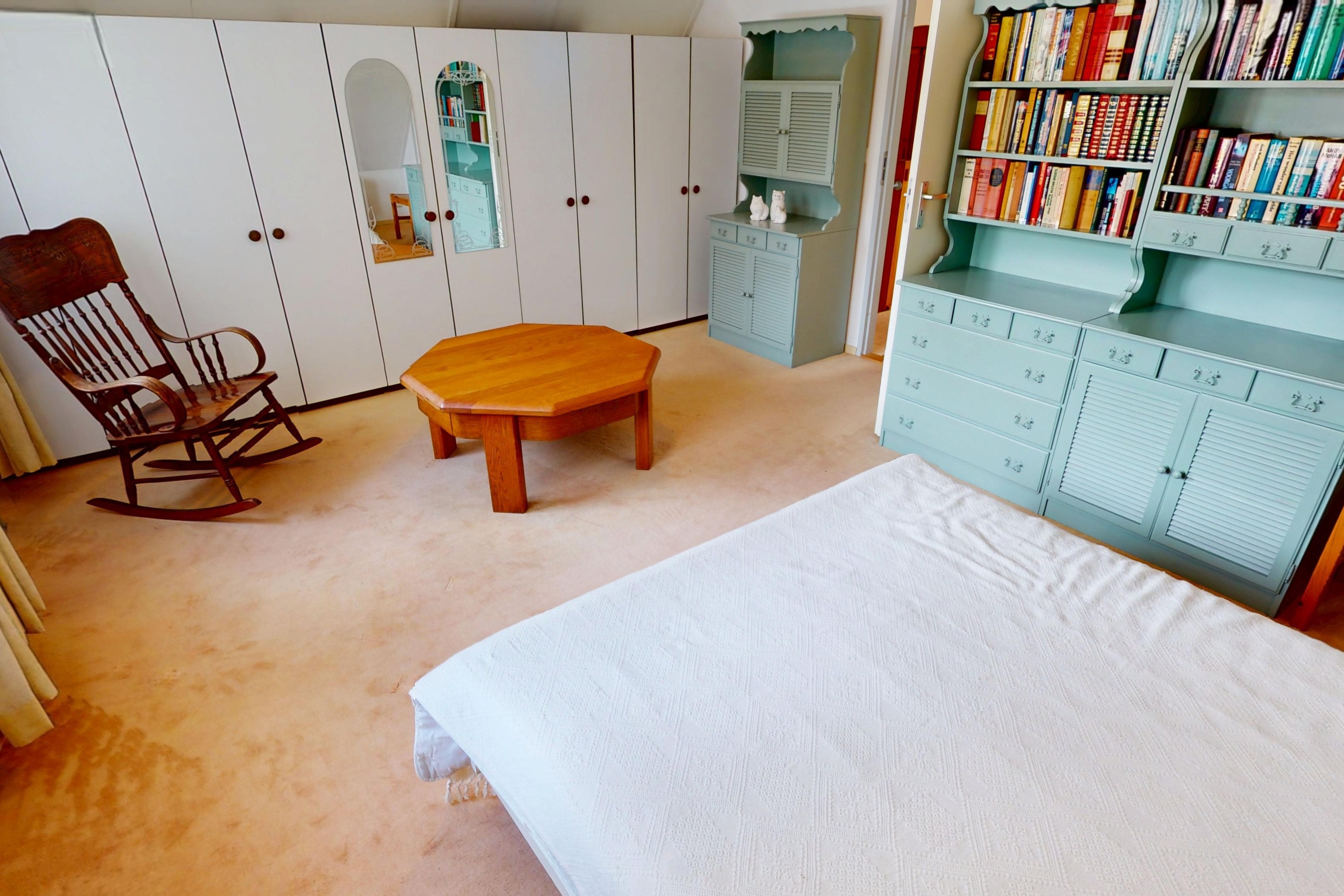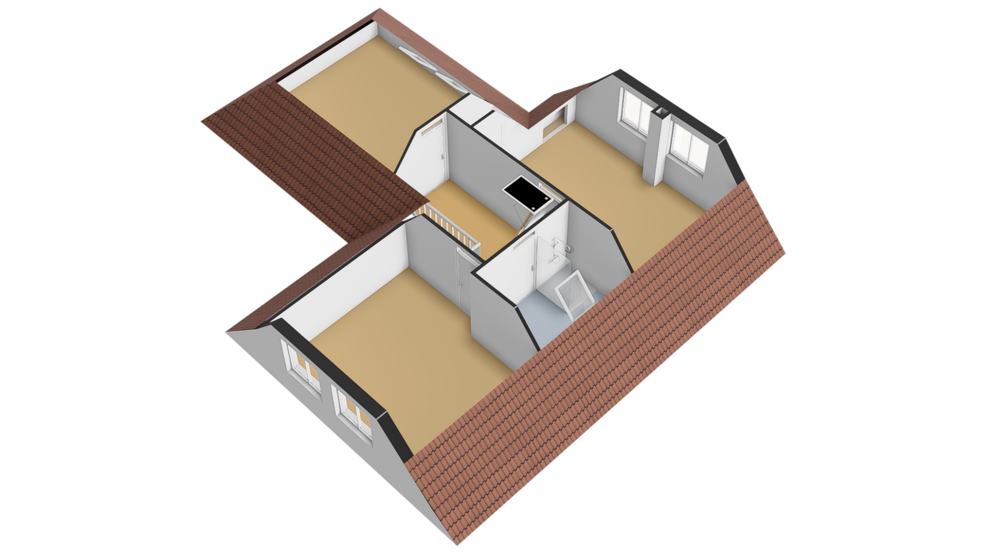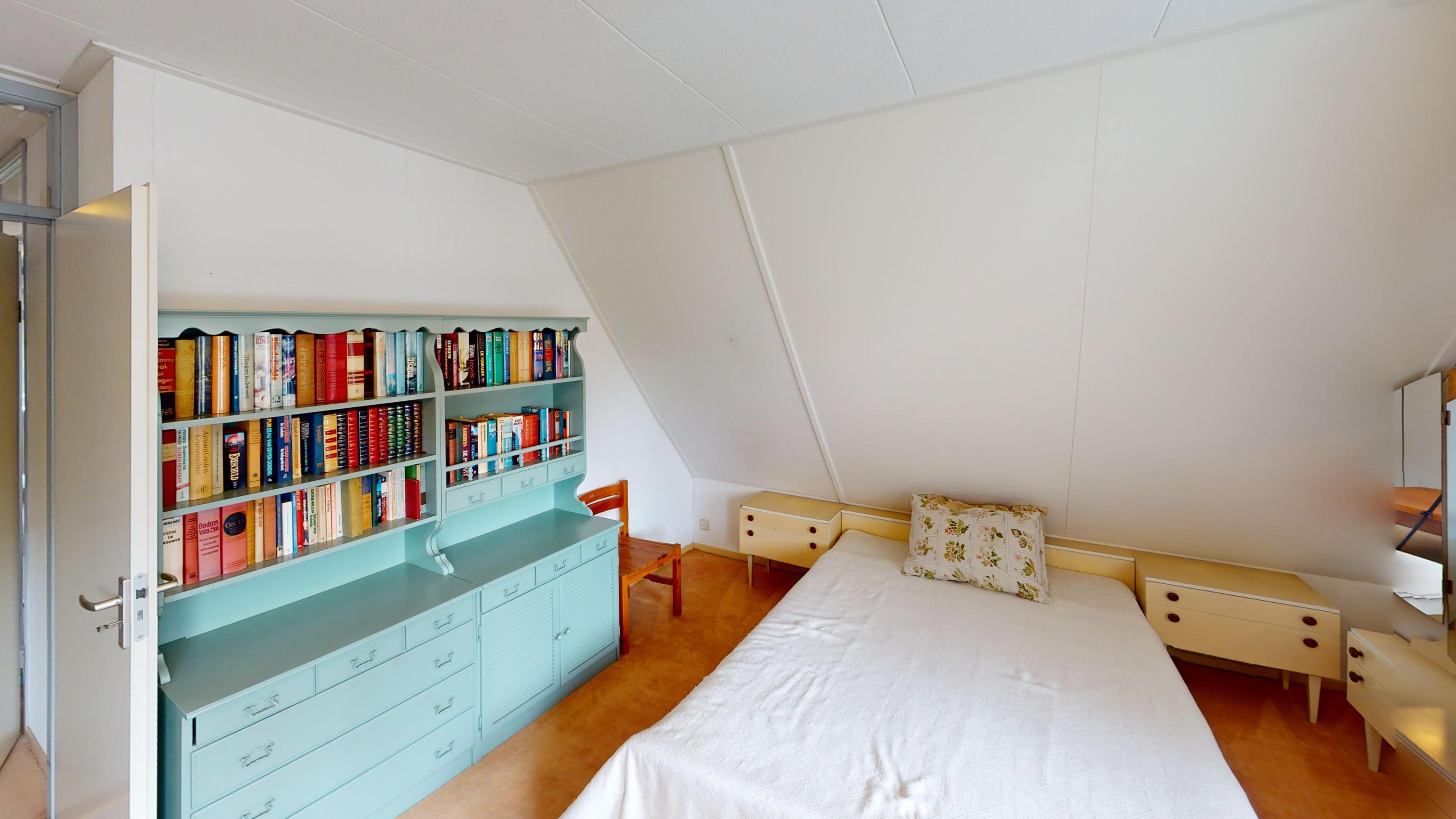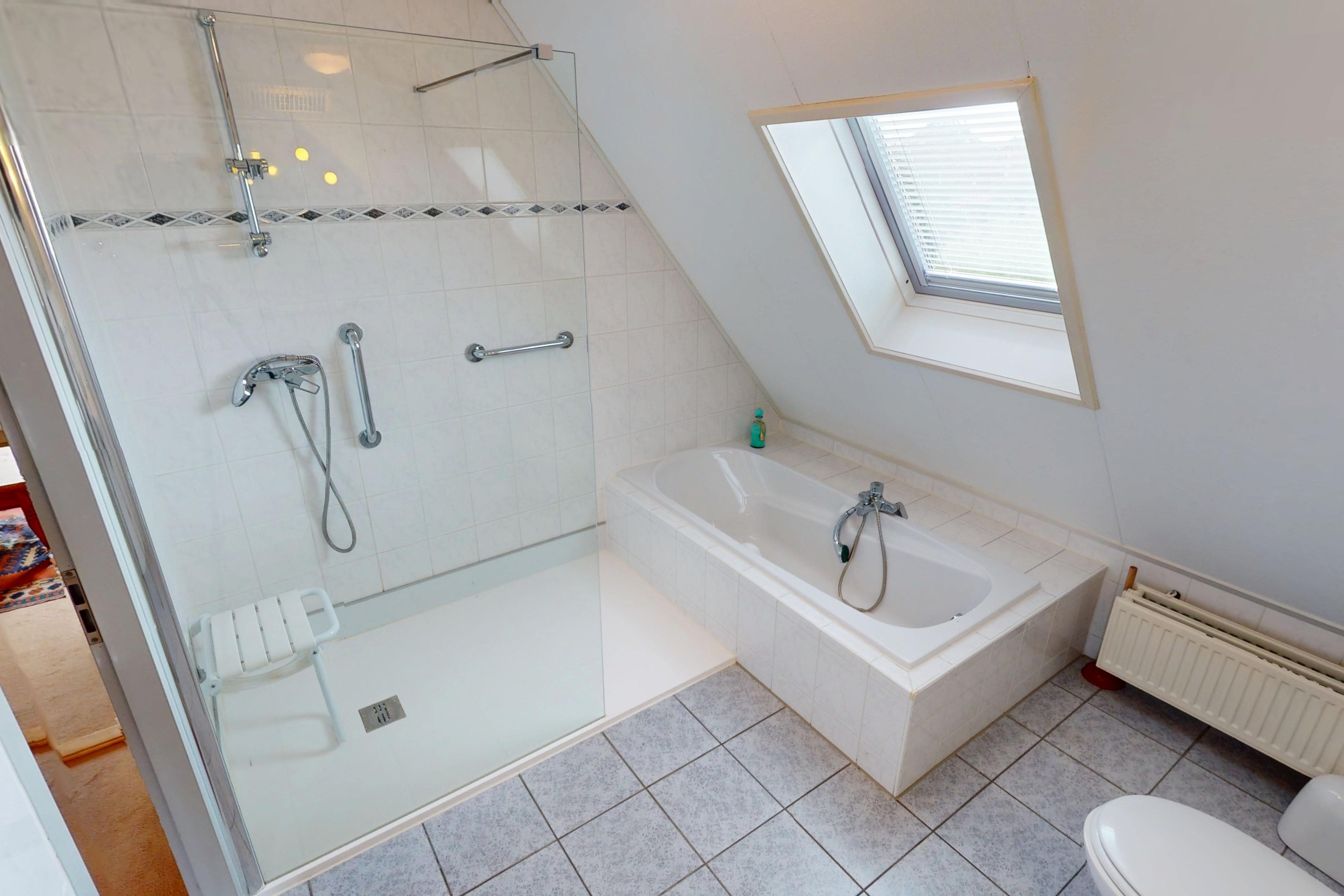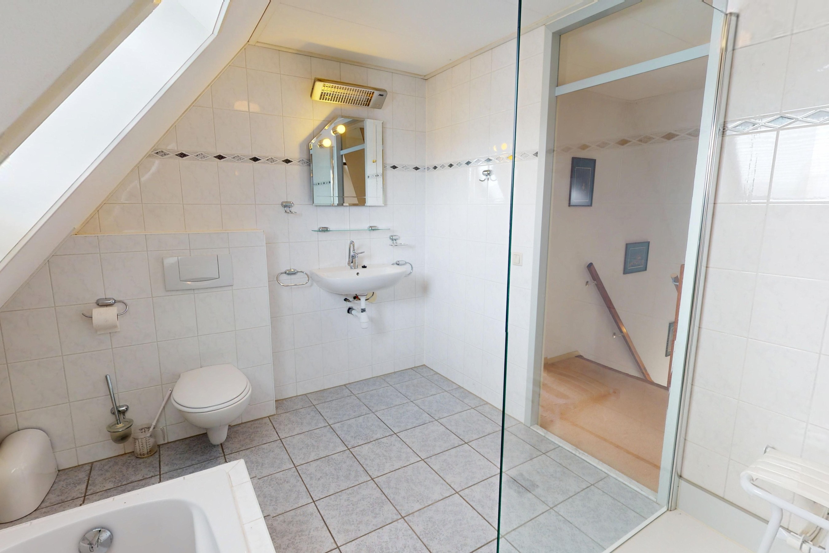 De keurige en ruime badkamer is uitgevoerd in een lichte kleurstelling en voorzien van een inloopdouche, ligbad, wastafel en een hangcloset. De badkamer is volledig betegeld en voorzien van dakraam, waardoor u deze ruimte op een natuurlijke manier kunt ventileren!