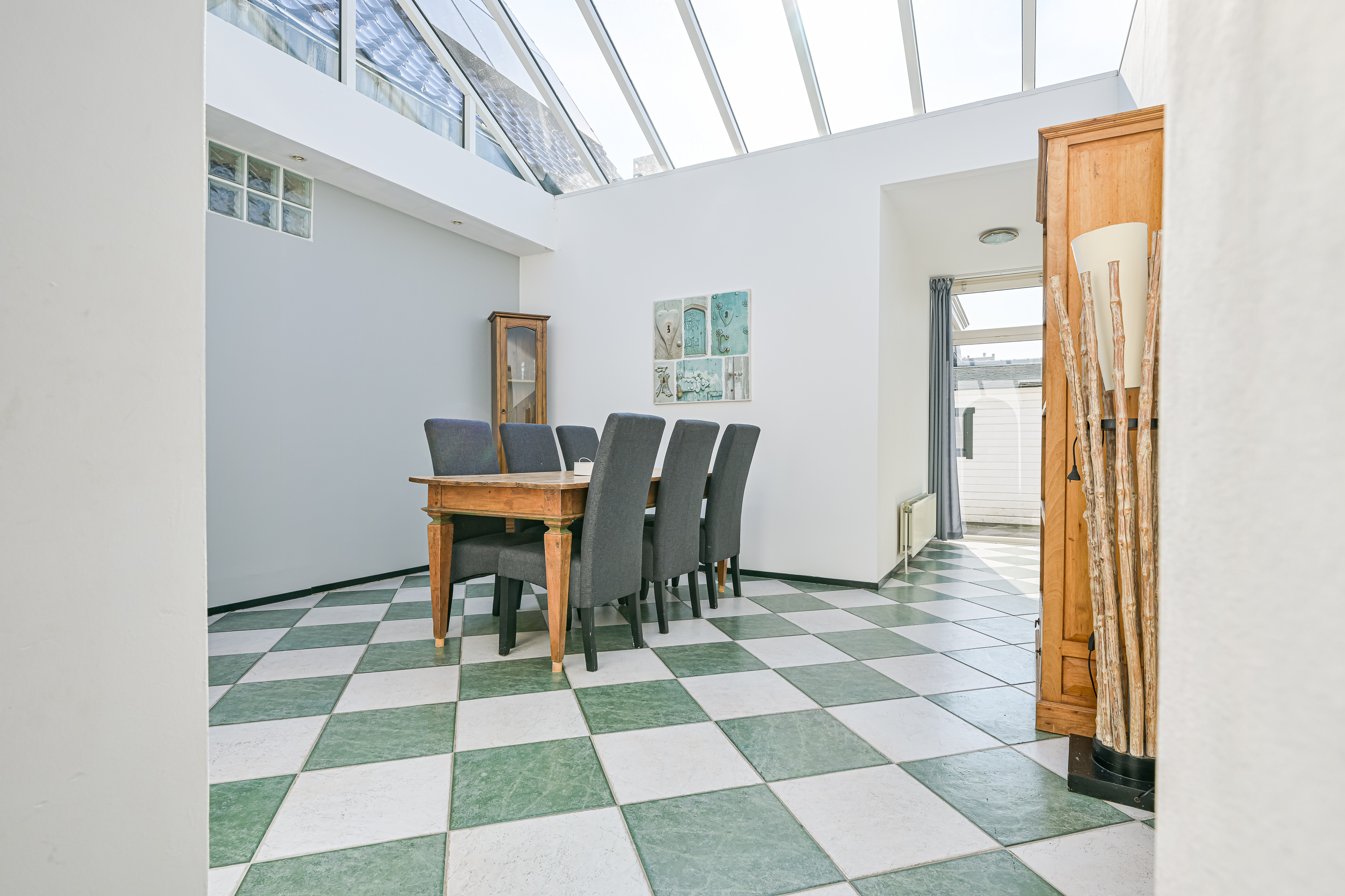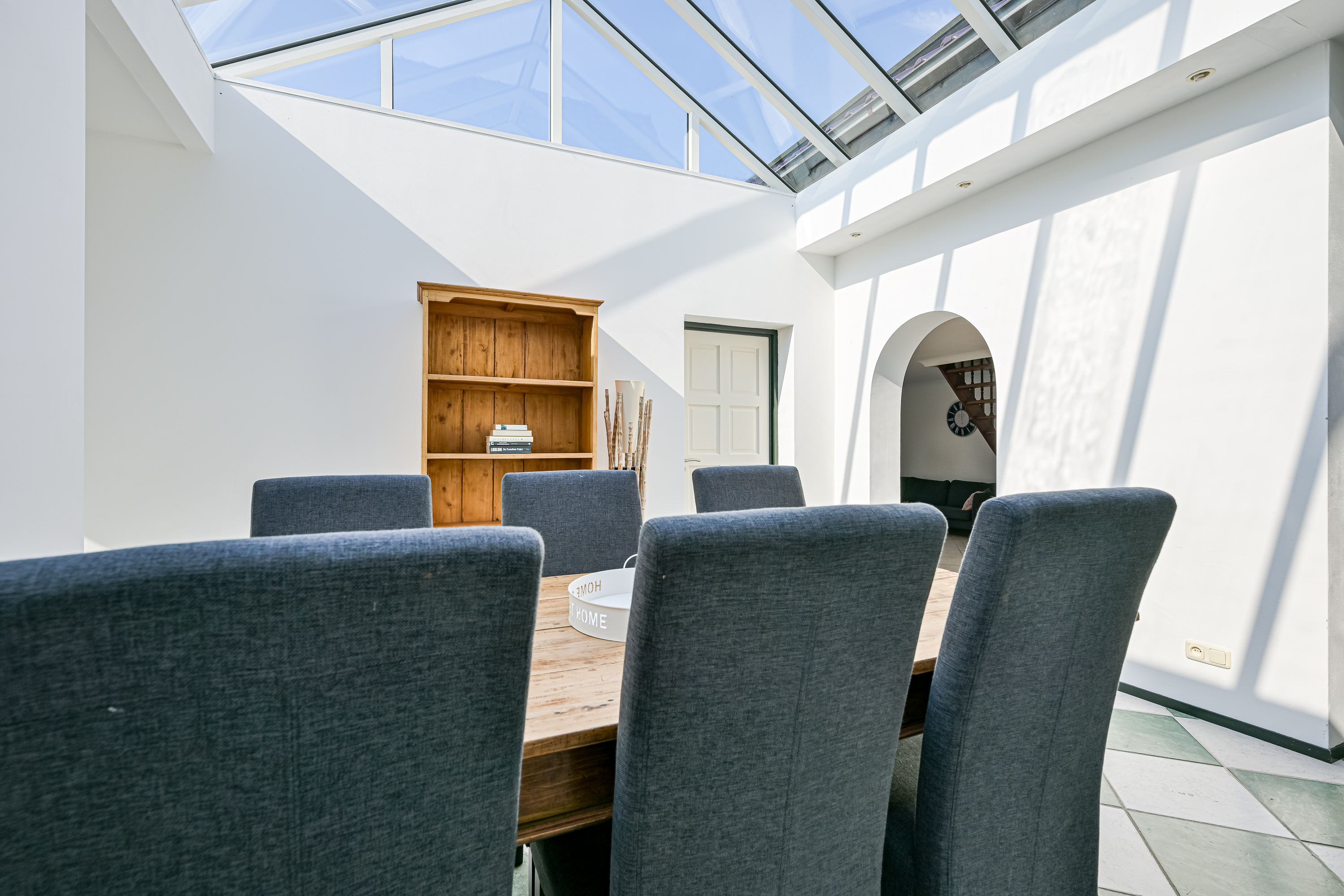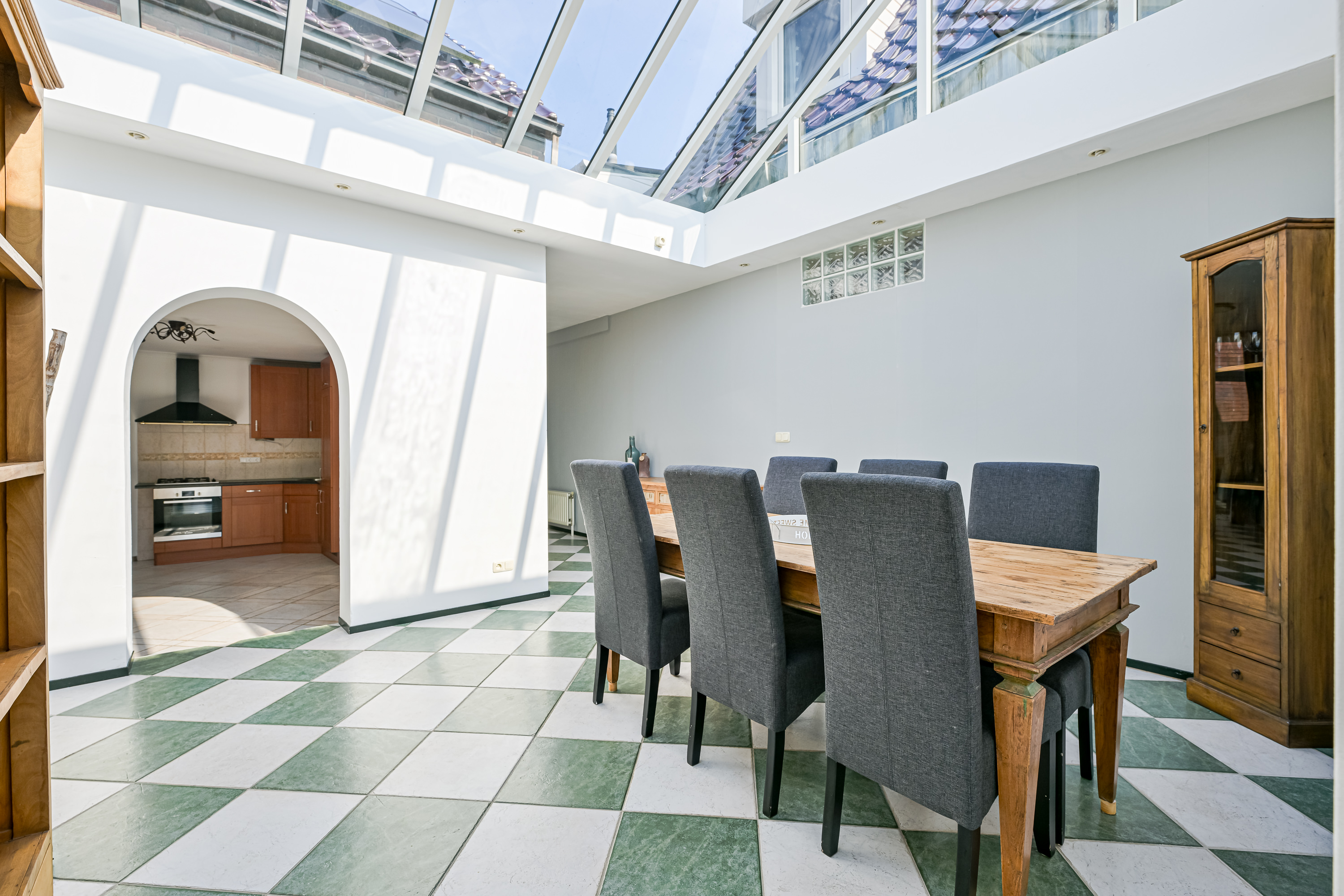 Als we via de aparte zij-ingang het achterste deel van de woning binnengaan, komen we in de eerste instantie uit bij wat vroeger de garage was. Deze ruimte kunt u beschouwen als bijkeuken of aparte wasruimte waar u uw wasmachine en droger ook zou kunnen plaatsen omdat ook hier een aansluiting voor aanwezig is. Deze ruimte heeft ook de ideale afmetingen om dienst te doen als separate kantoorruimte of sportkamer. We vervolgen onze weg richting de 2e woonkamer, maar niet zonder even stil te staan bij dit prachtige grote atrium van maar liefst 17m2. Ziet u zichzelf hier al zitten op een late zomeravond, kijkend naar de vallende sterren met een goed glas wijn in de hand? Of juist met het vroege ochtendzonnetje en een heerlijk kopje koffie aan de keukentafel op uw gemak de krant lezen. Zodra u zich in deze ruimte bevind voelt u zich alsof u in een vakantievilla aan de middellandse zee bent, dit komt mede door de lichtinval, de diagonaal gelegen plavuizen met speelse kleuren en de muren met karakteristieke bogen die veel in Mediterraanse dorpjes voorkomen.