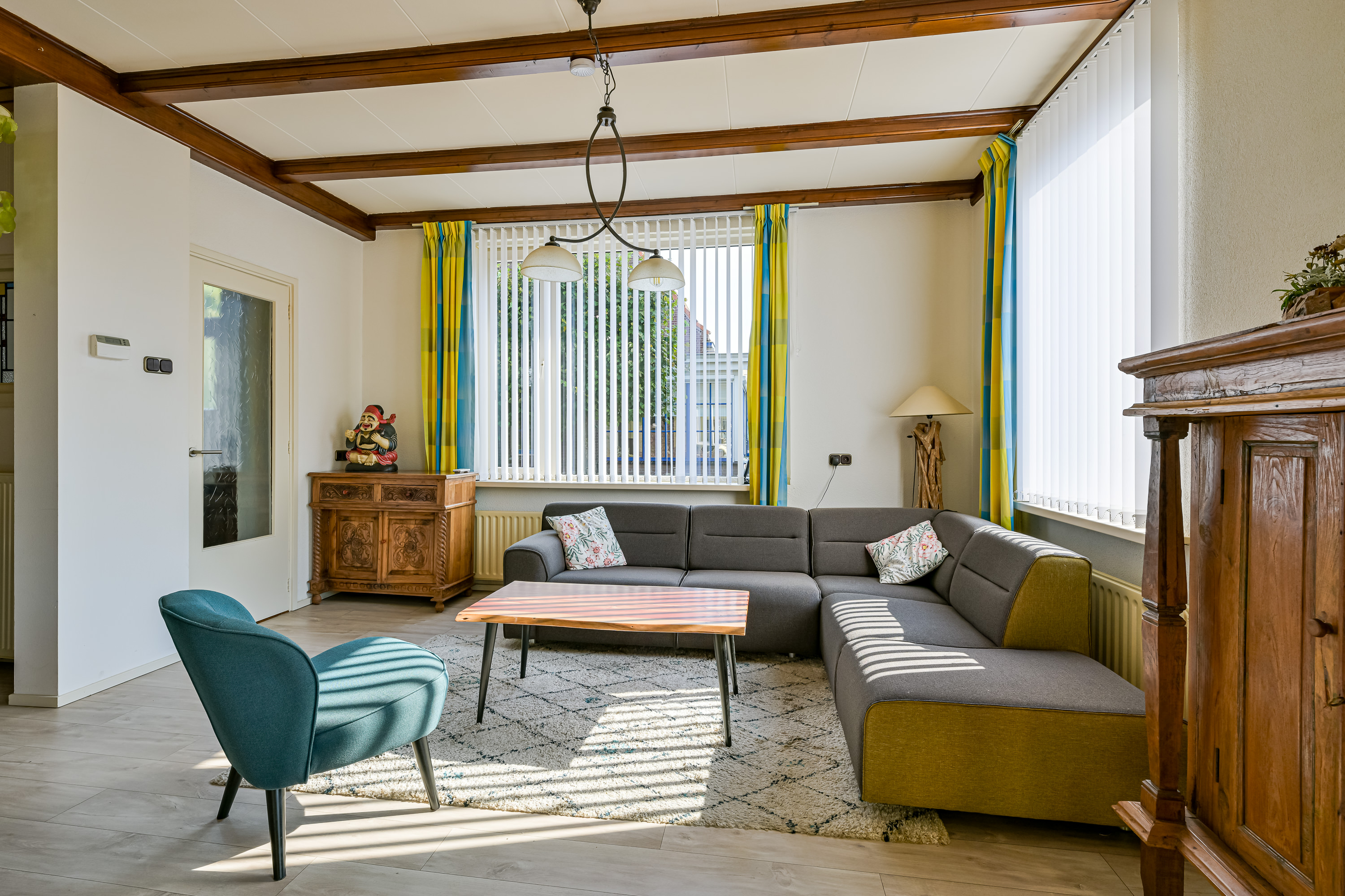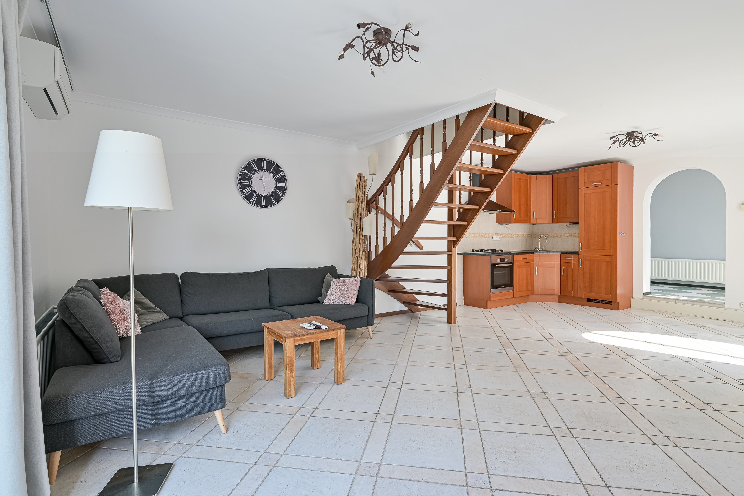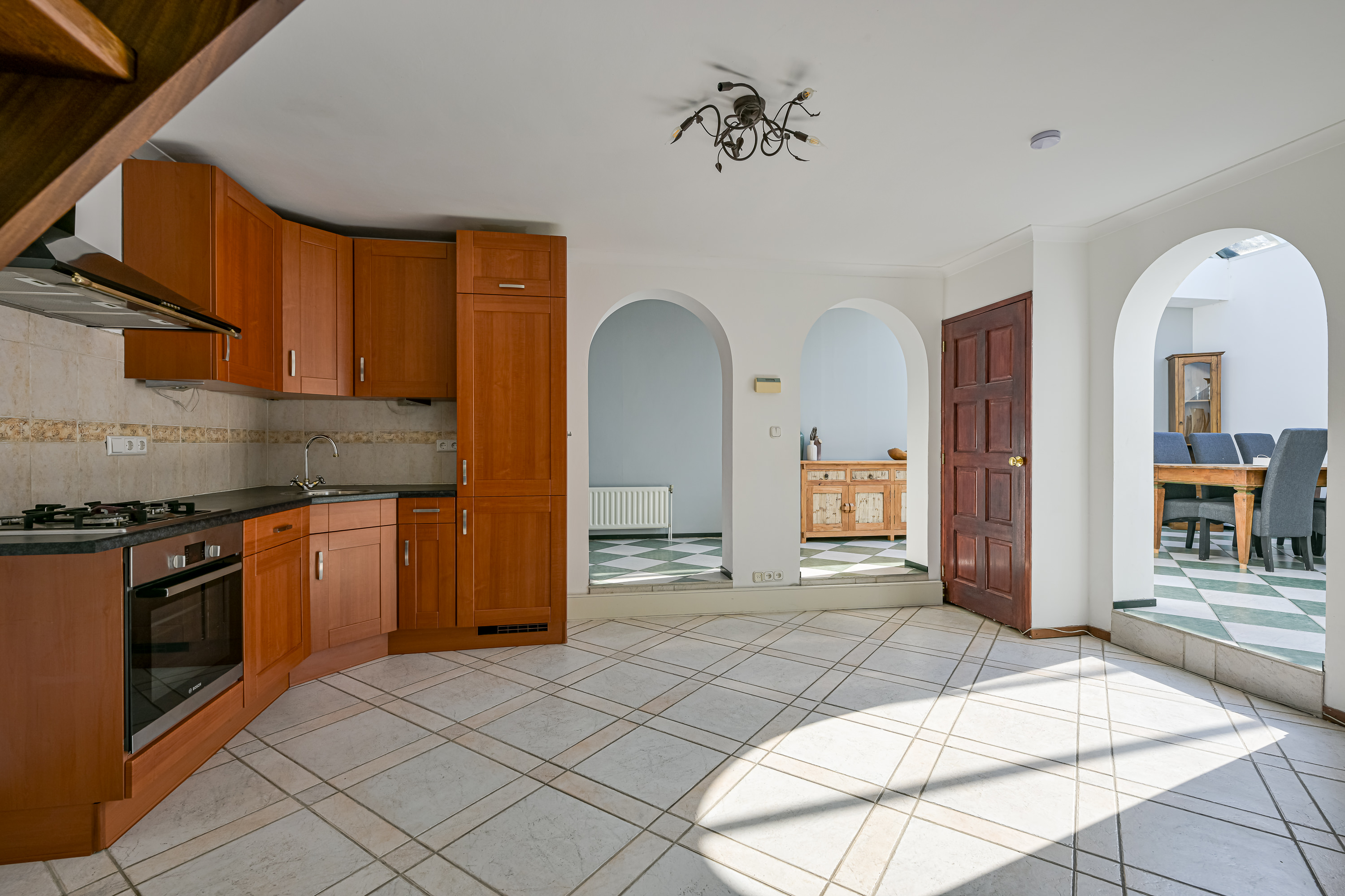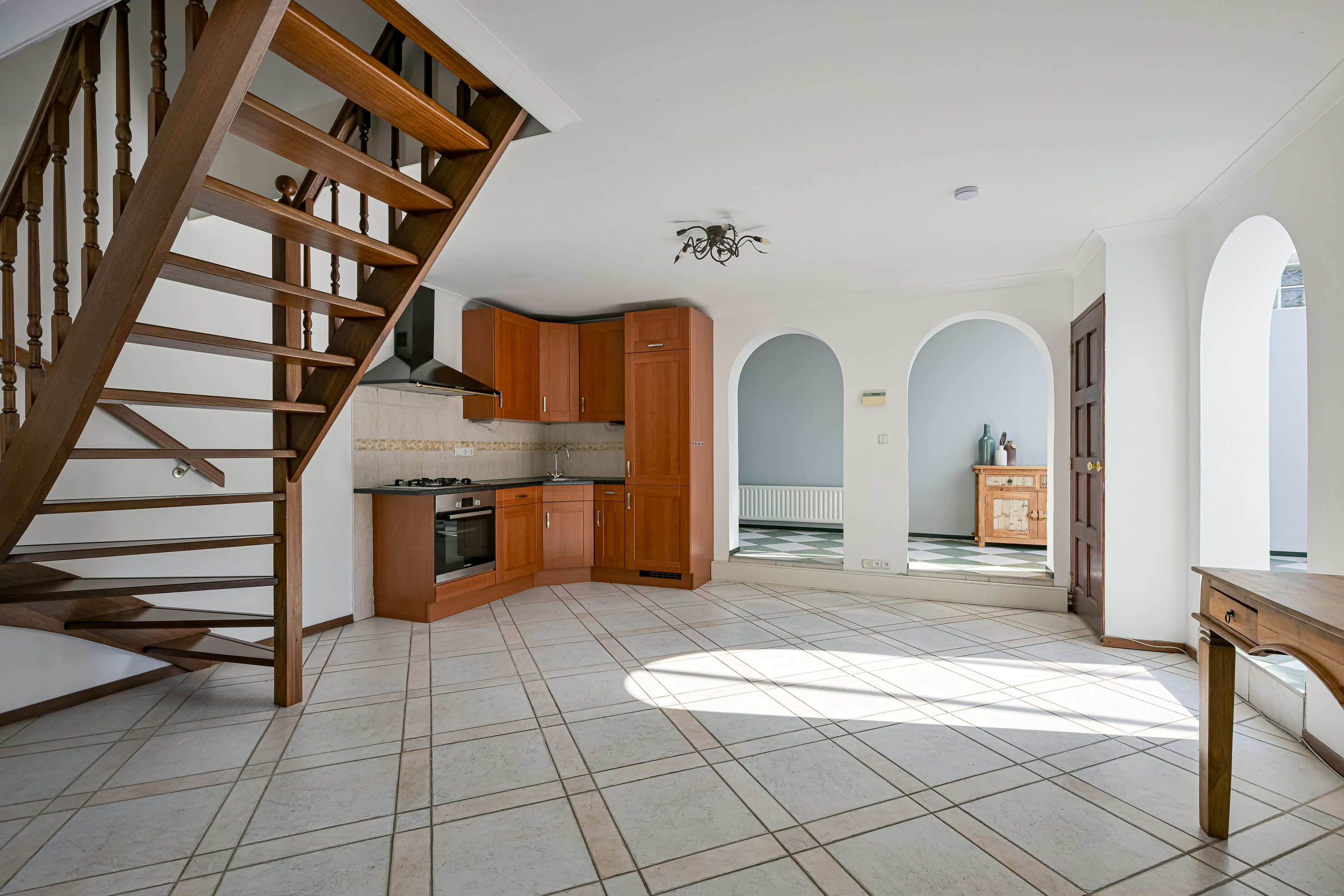 Als we via de aparte zij-ingang het achterste deel van de woning binnengaan, komen we in de eerste instantie uit bij wat vroeger de garage was. Deze ruimte kunt u beschouwen als bijkeuken of aparte wasruimte waar u uw wasmachine en droger ook zou kunnen plaatsen omdat ook hier een aansluiting voor aanwezig is. Deze ruimte heeft ook de ideale afmetingen om dienst te doen als separate kantoorruimte of sportkamer. We vervolgen onze weg richting de 2e woonkamer, maar niet zonder even stil te staan bij dit prachtige grote atrium van maar liefst 17m2. Ziet u zichzelf hier al zitten op een late zomeravond, kijkend naar de vallende sterren met een goed glas wijn in de hand? Of juist met het vroege ochtendzonnetje en een heerlijk kopje koffie aan de keukentafel op uw gemak de krant lezen. Zodra u zich in deze ruimte bevind voelt u zich alsof u in een vakantievilla aan de middellandse zee bent, dit komt mede door de lichtinval, de diagonaal gelegen plavuizen met speelse kleuren en de muren met karakteristieke bogen die veel in Mediterraanse dorpjes voorkomen.
