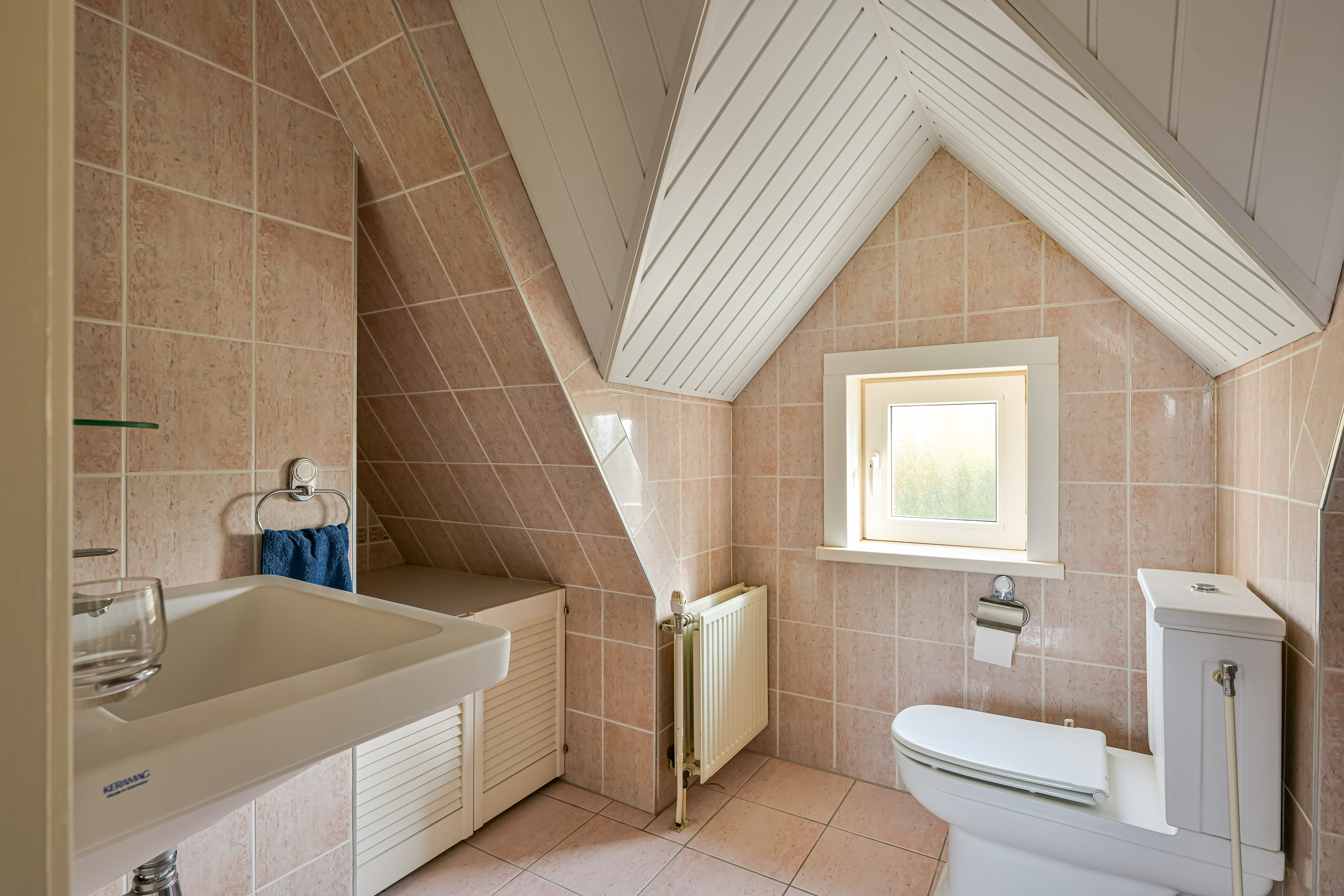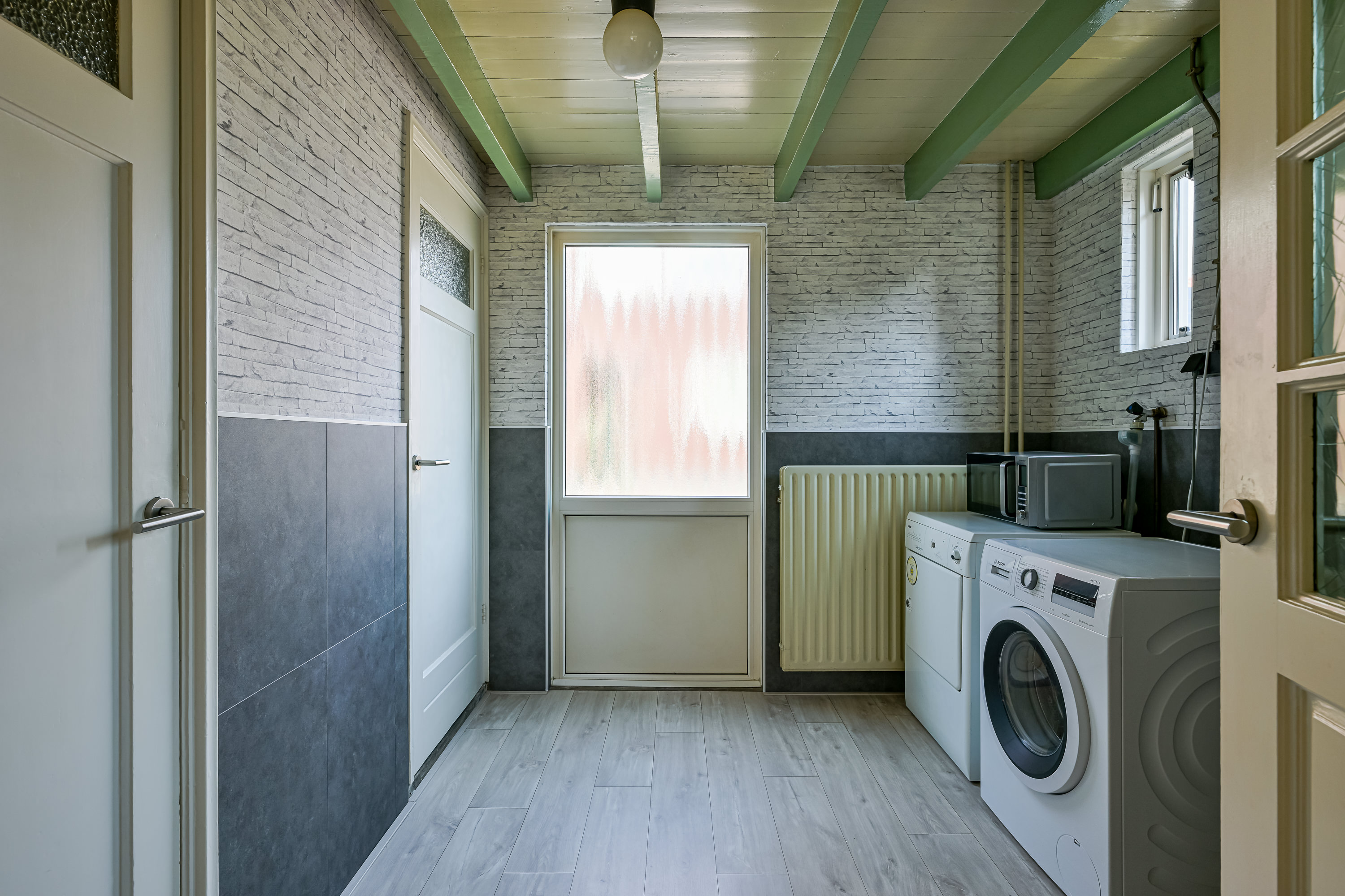 Voorbij de keuken en kelderruimte vindt u de bijkeuken met inbouwkast, wasmachine/droger opstelling, een toilet en een middels een vlizotrap bereikbare zeer recent geïsoleerde vliering met dakkapel waar de CV combiketel en de omvormer voor de 17 zonnepanelen geplaatst is.