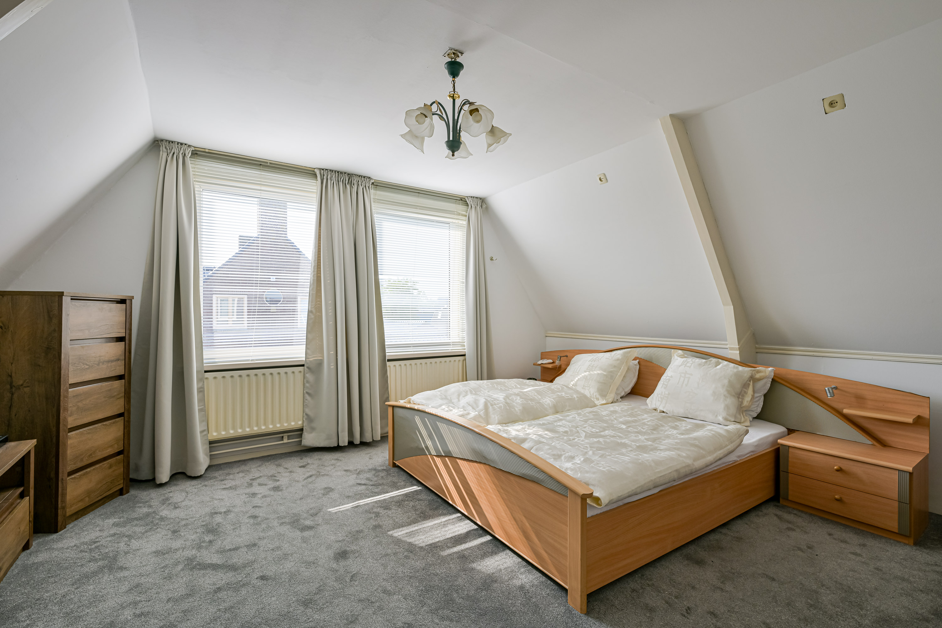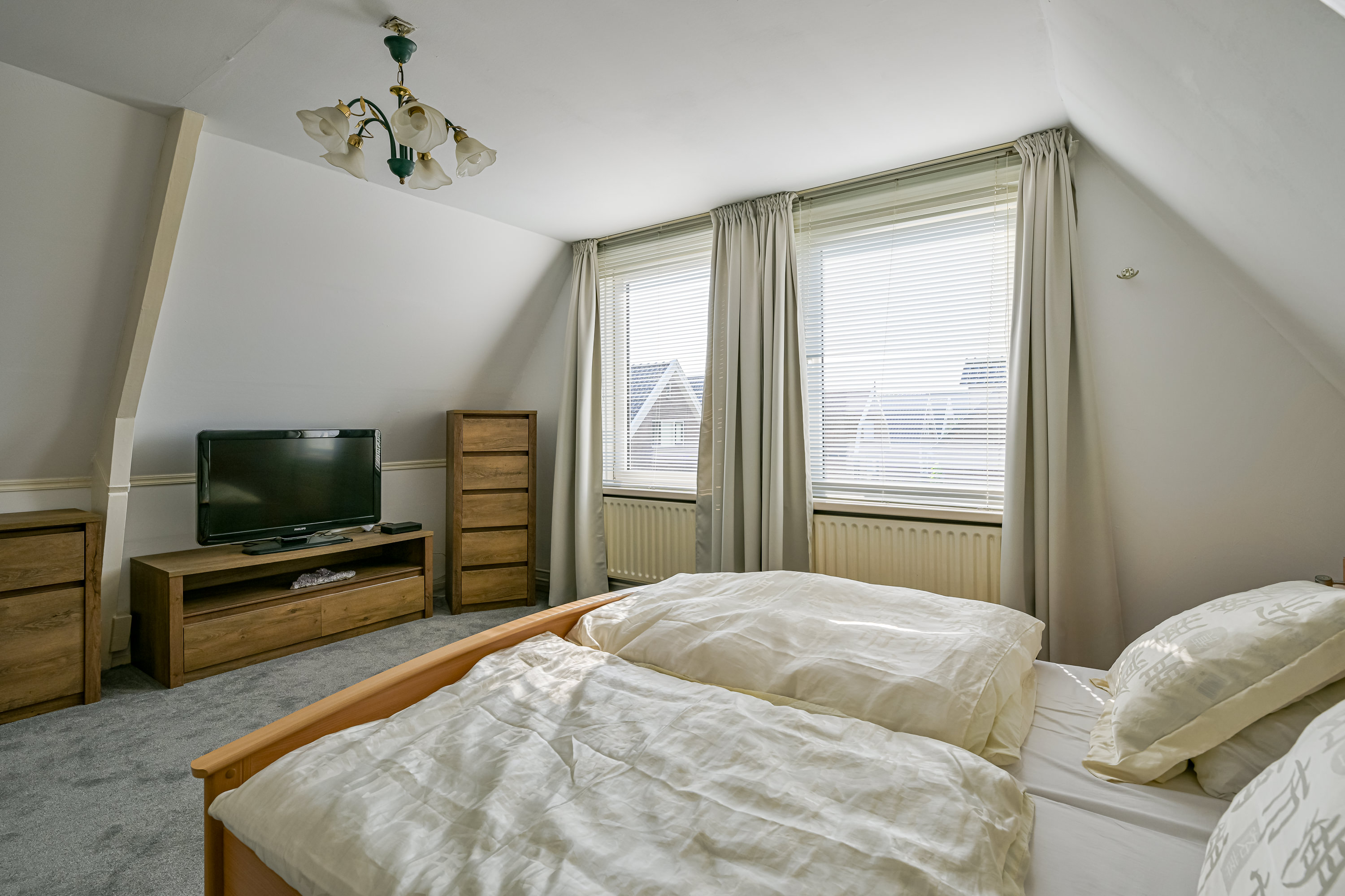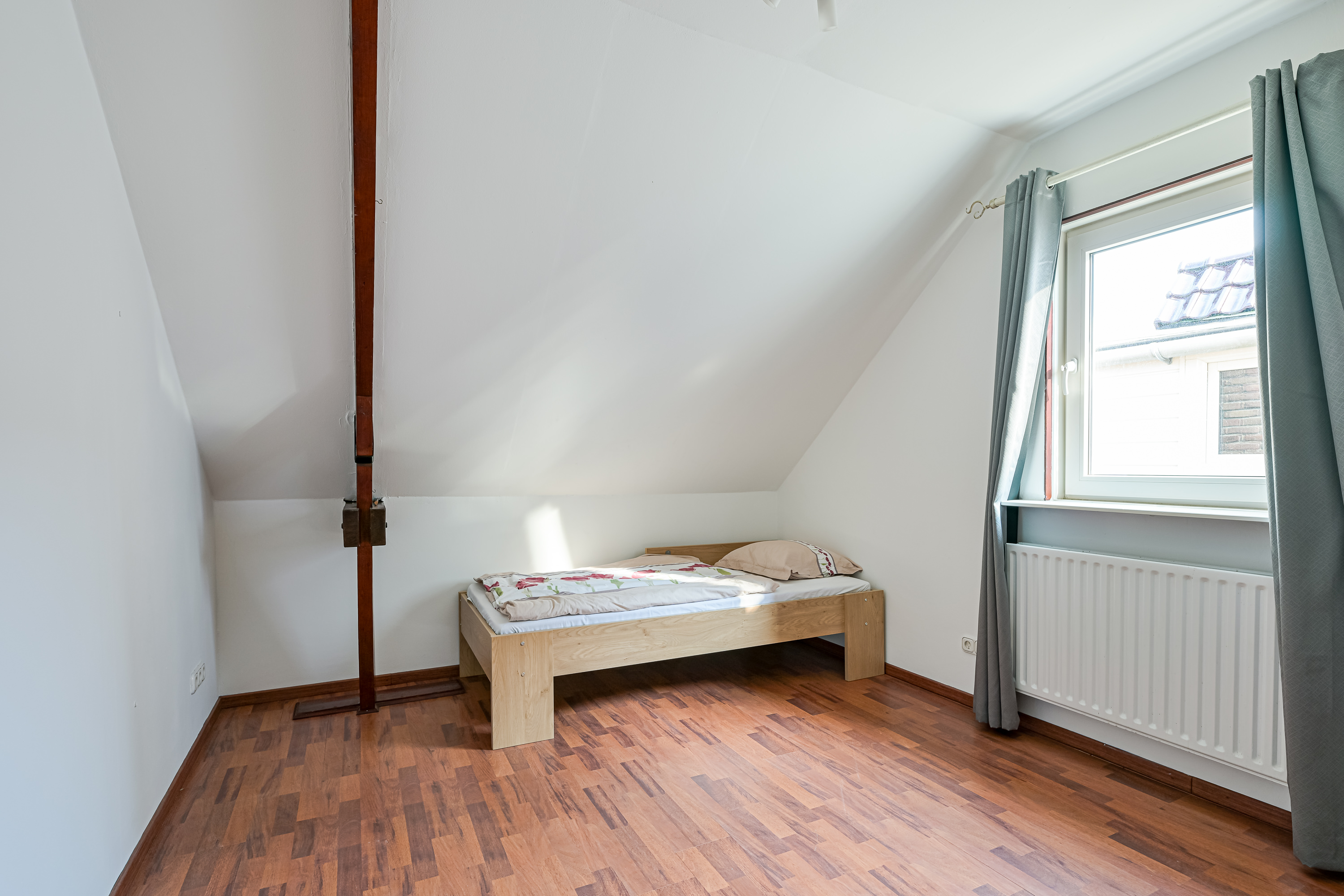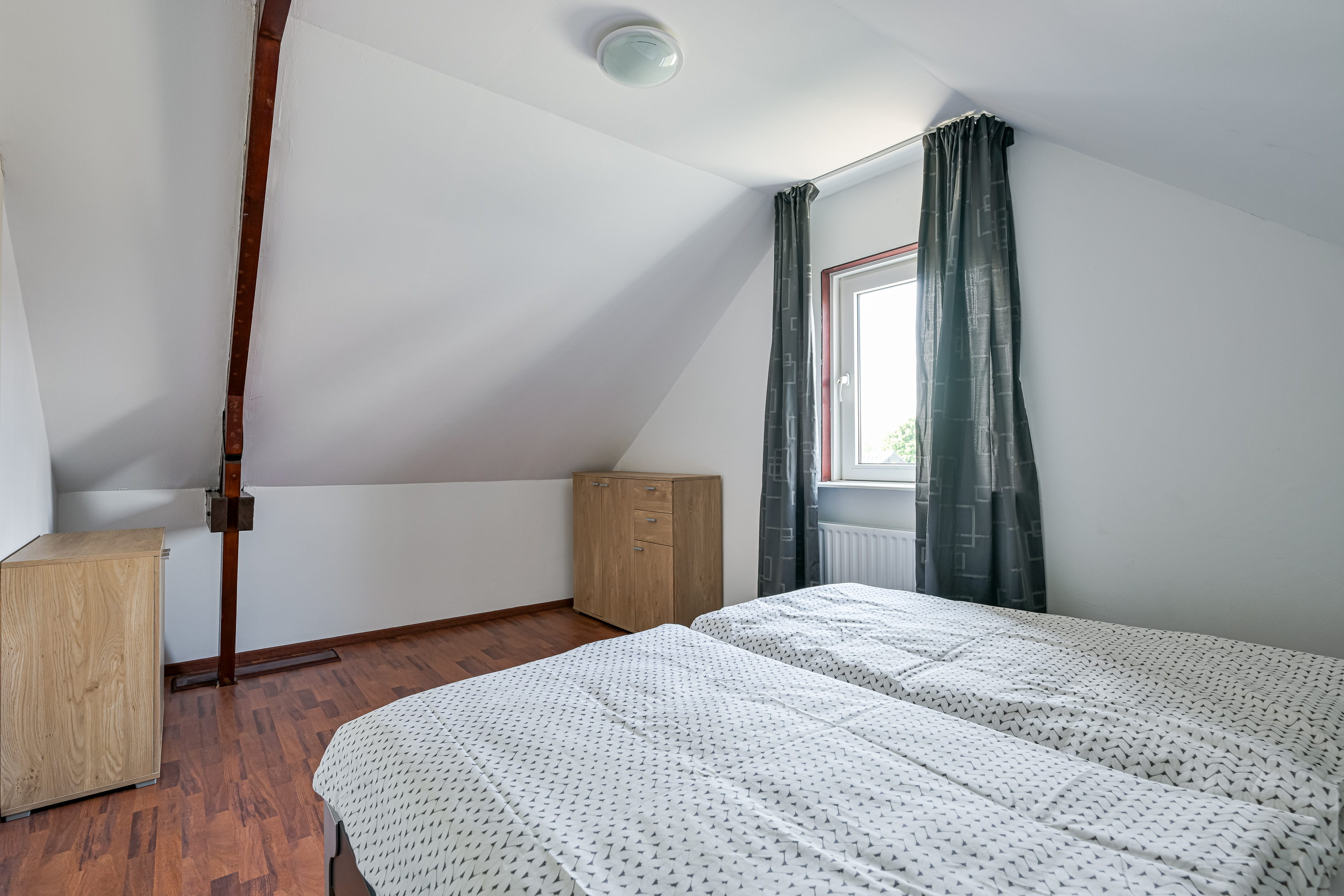 Als we de trap opgaan komen we boven uit in de gang met inpandige bergkast en twee nagenoeg gespiegelde ruime slaapkamers, waarbij nog originele details te zien zijn van de eikenhouten dakconstructie, verder zijn de kamers strak afgewerkt en voorzien van kunststof kozijnen met HR++ isolatieglas.
