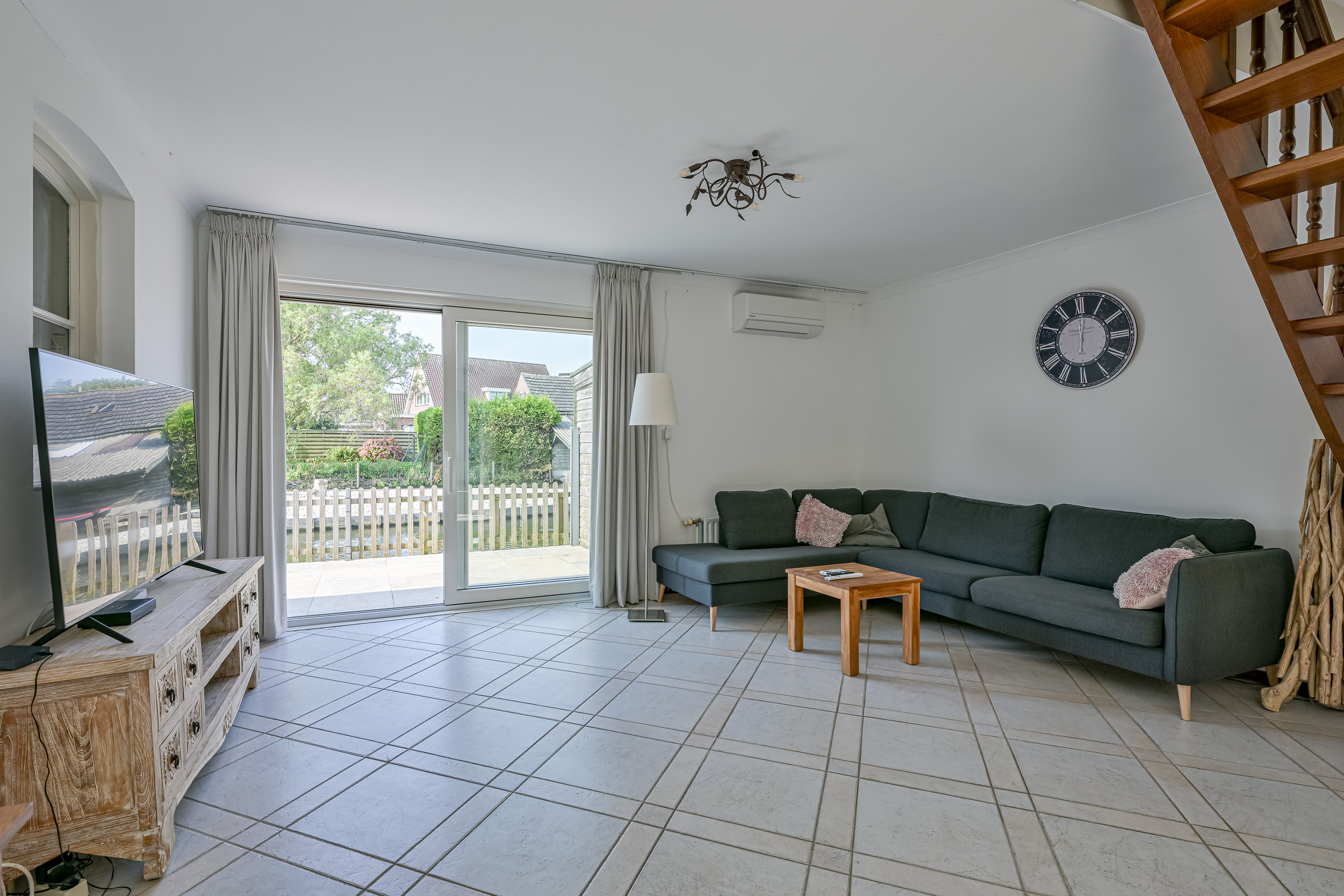 De 2e woonkamer is gezellig ingericht met een plavuizen vloer die voorzien is van vloerverwarming, ook is de woonkamer voorzien van een grote schuifpui uitkijkend op het doorgaande vaarwater en met een zeer krachtige airconditioning zodat alles lekker koel blijft. De 2e open keuken is uitgevoerd in een donkerdere kersenhout kleur en wederom voorzien van alle gemakken en inbouw apparatuur zoals koel/vriescombi, een vaatwasser, oven met grill en een gaskookplaat met afzuigkap.