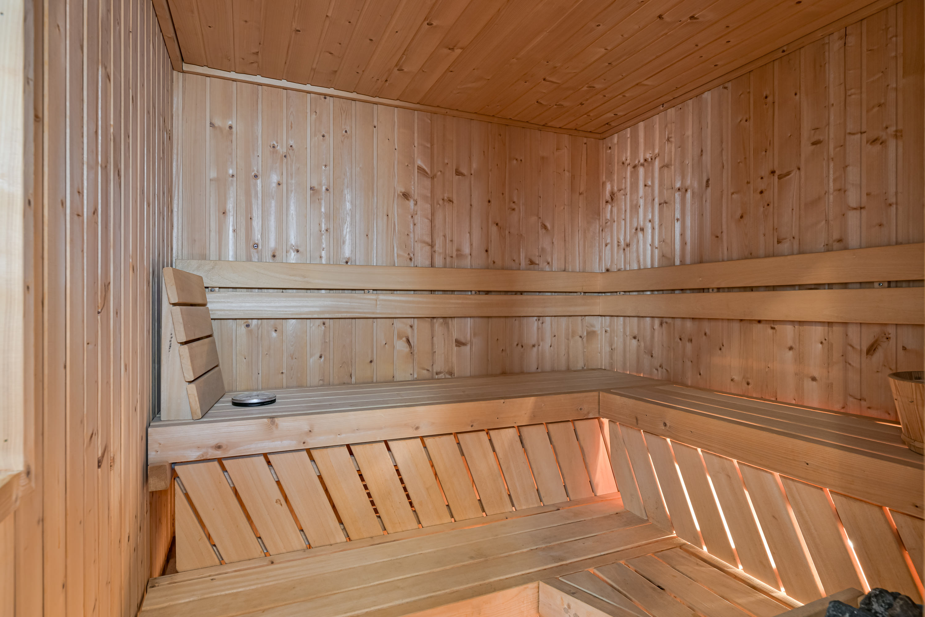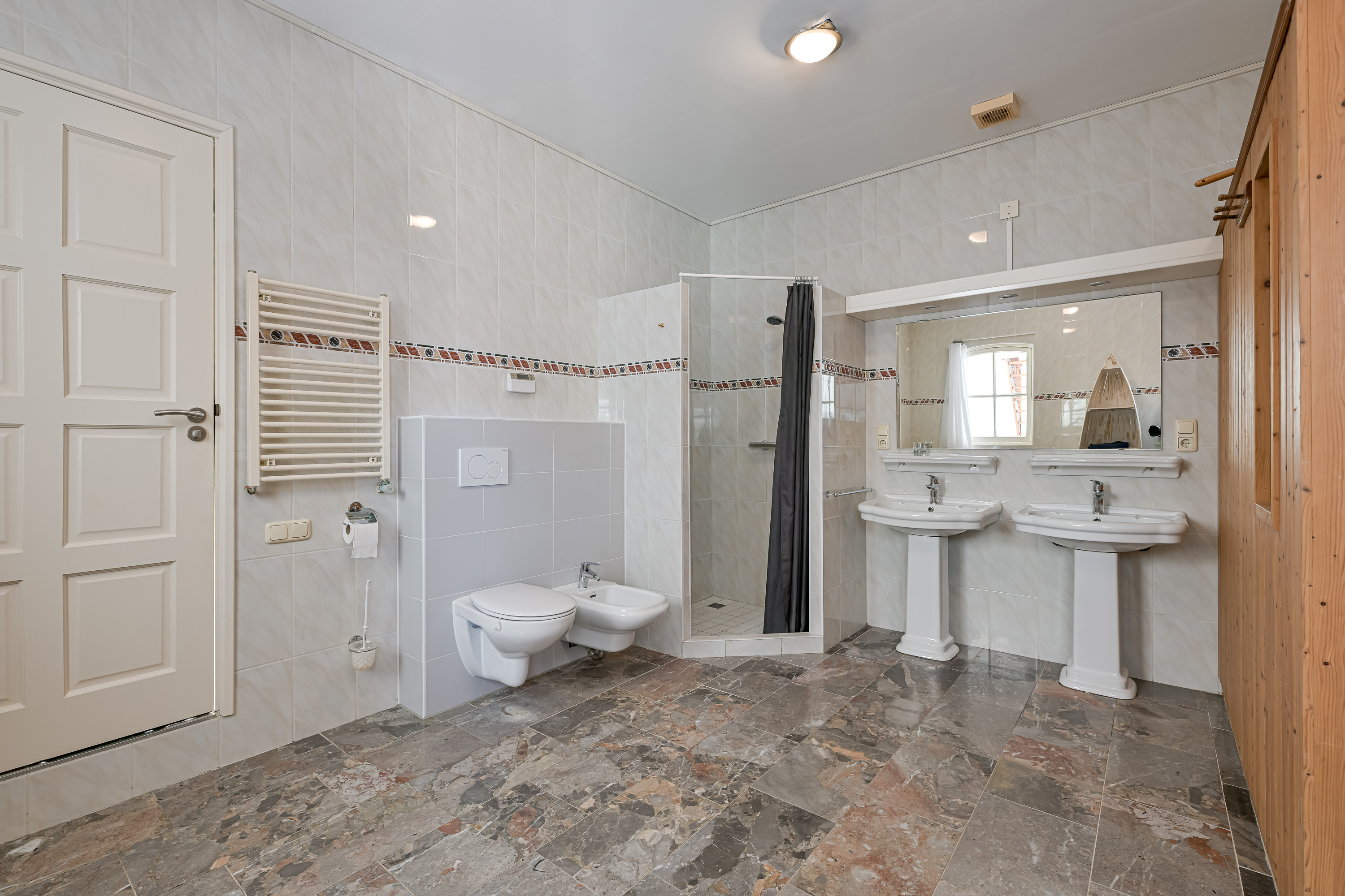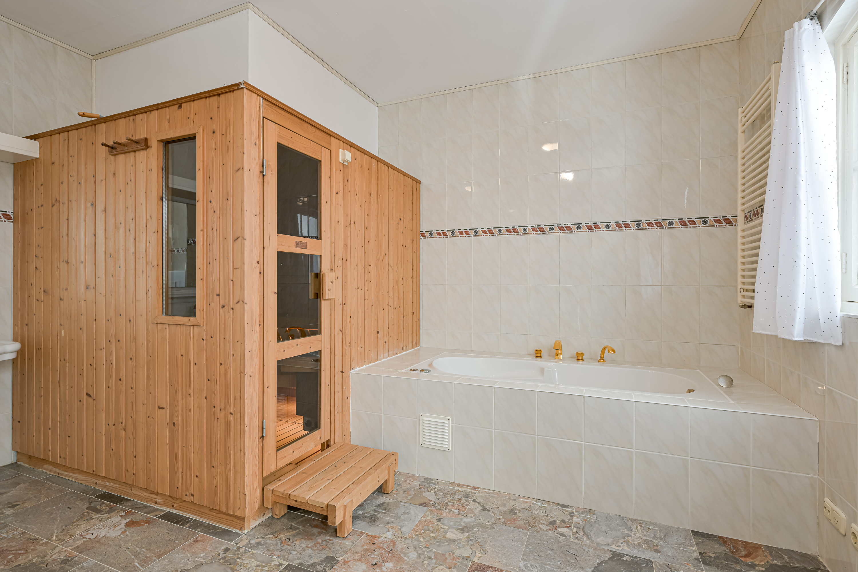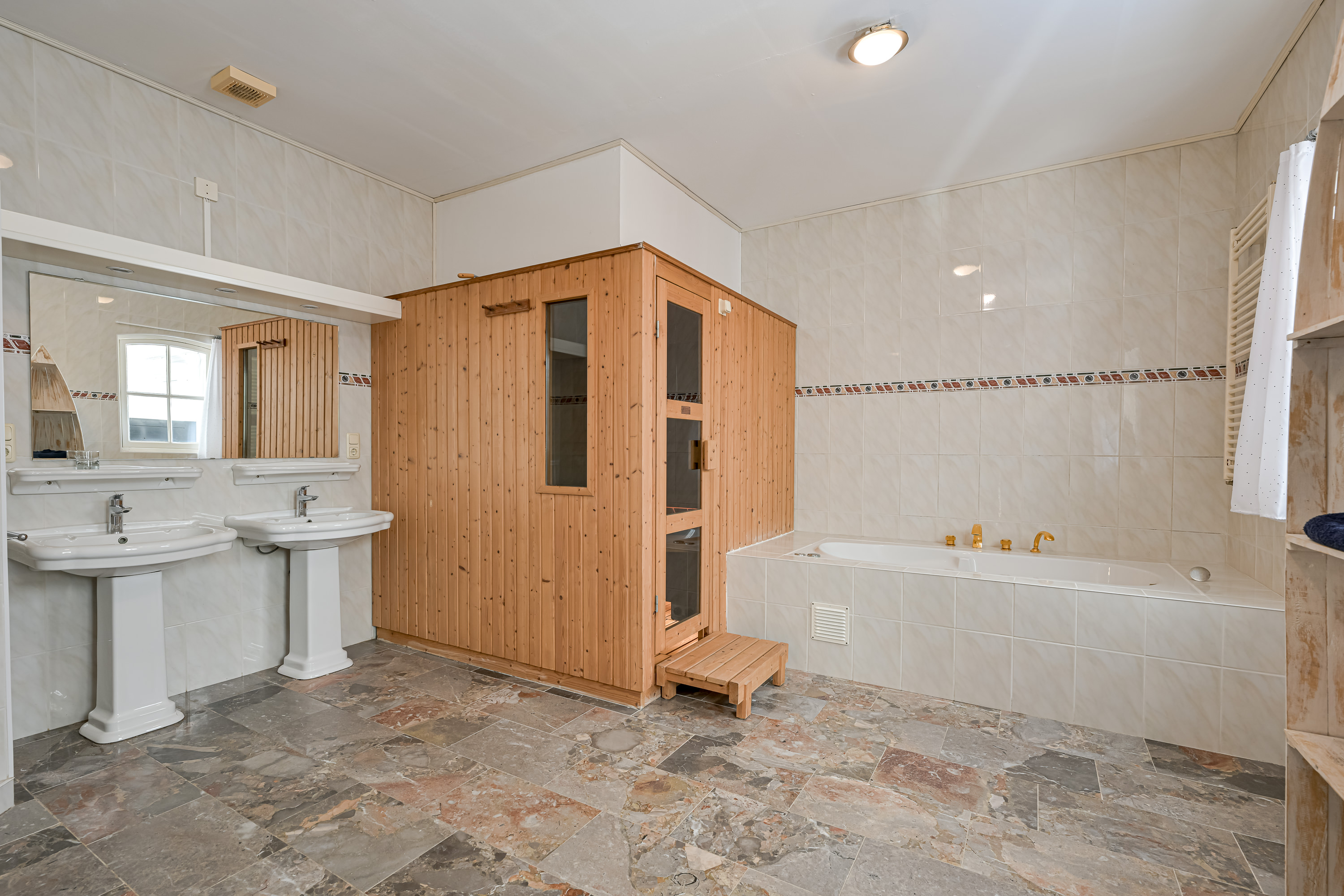 Links bevind zich de 2e badkamer die wel wat weg heeft van uw eigen privé wellness en voorzien is van een groot bad, een luxe en royale Finse sauna die groot genoeg is voor 4 volwassen personen, een vrij hangend wandcloset, een bidet, 2 wastafels met een zeer grote spiegel en een douche waar 2 thermostaat kranen u afwisselend van de nodige koud en warmwaterstralen kunnen voorzien nadat u volkomen ontspannen de sauna uitkomt.