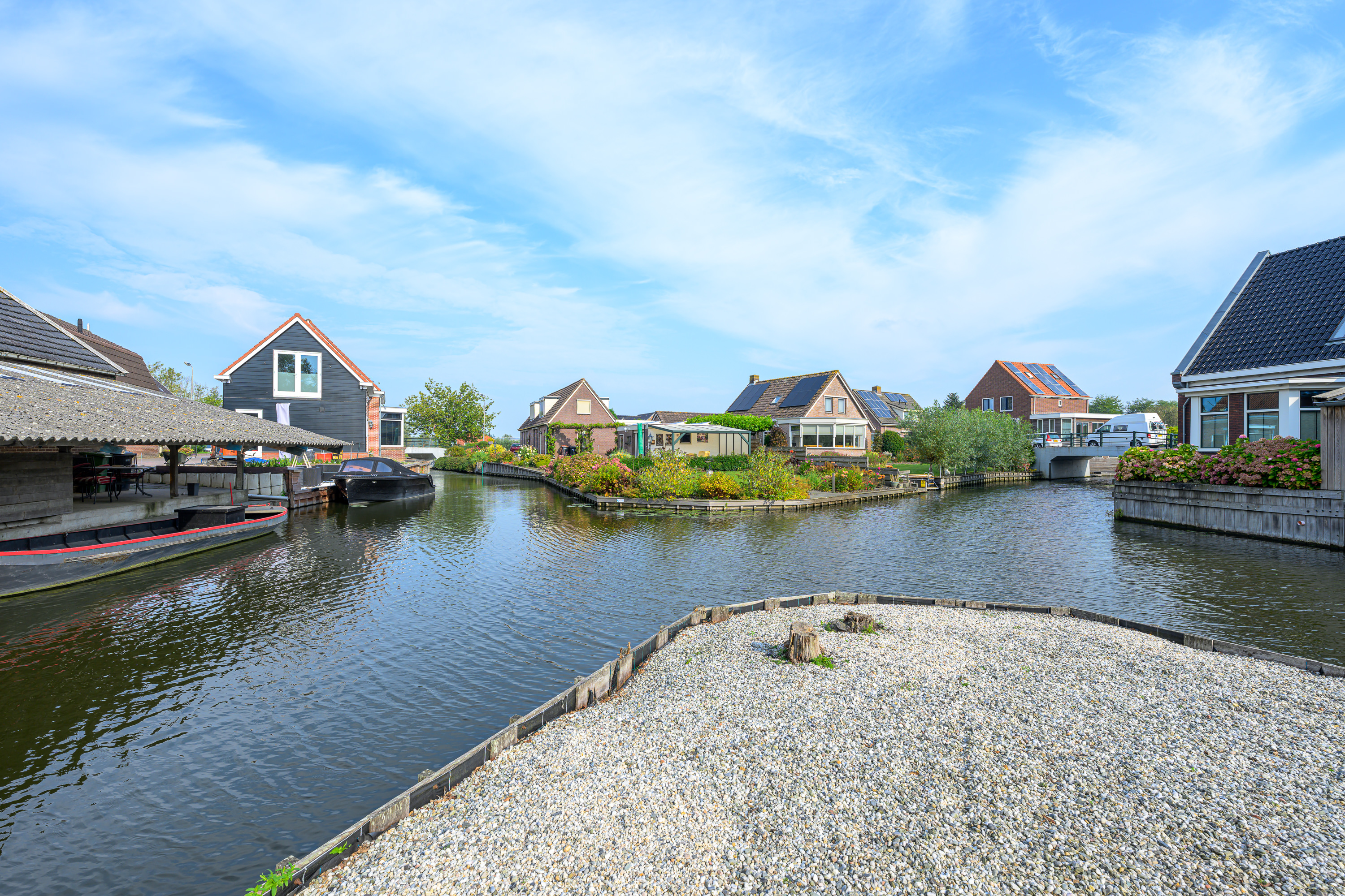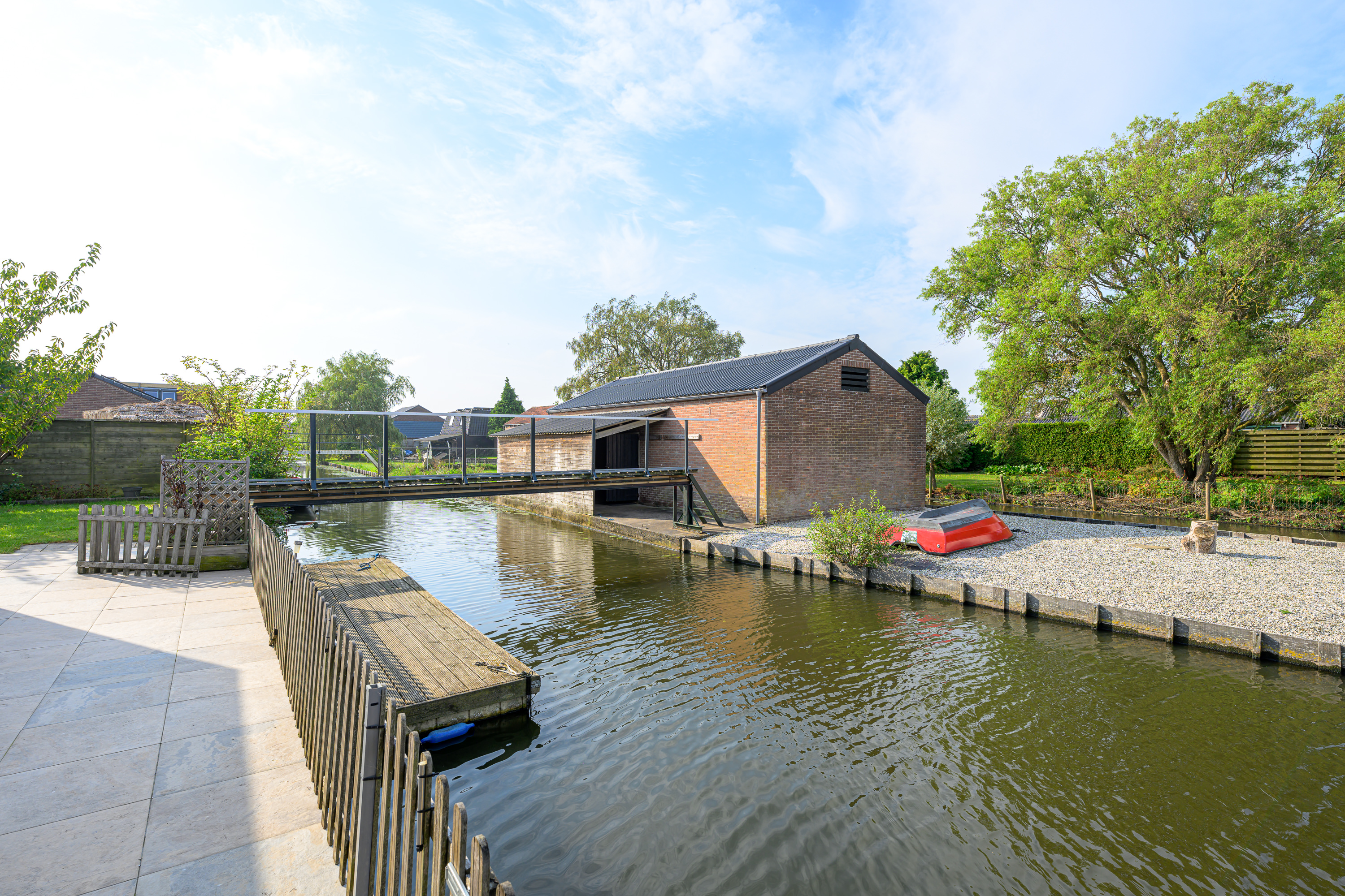 Het eiland is zoals gezegd bereikbaar via de loopbrug of de op maat gemaakte ponton die u overdwars kunt vastleggen zodat het eiland en de bijna 65m² grote stenen opslagschuur ten volle benut kan worden. Vroeger deed de schuur dienst als agrarische opslag en kon het fruit en groente verder Lutjebroek en andere dorpen bereiken via een kleine platte sloep, vandaar dat het eiland in het huidige bestemmingsplan nog steeds deze bestemming heeft. Uiteraard mag u in de schuur in de huidige dagen gelukkig ook andere spullen opslaan.