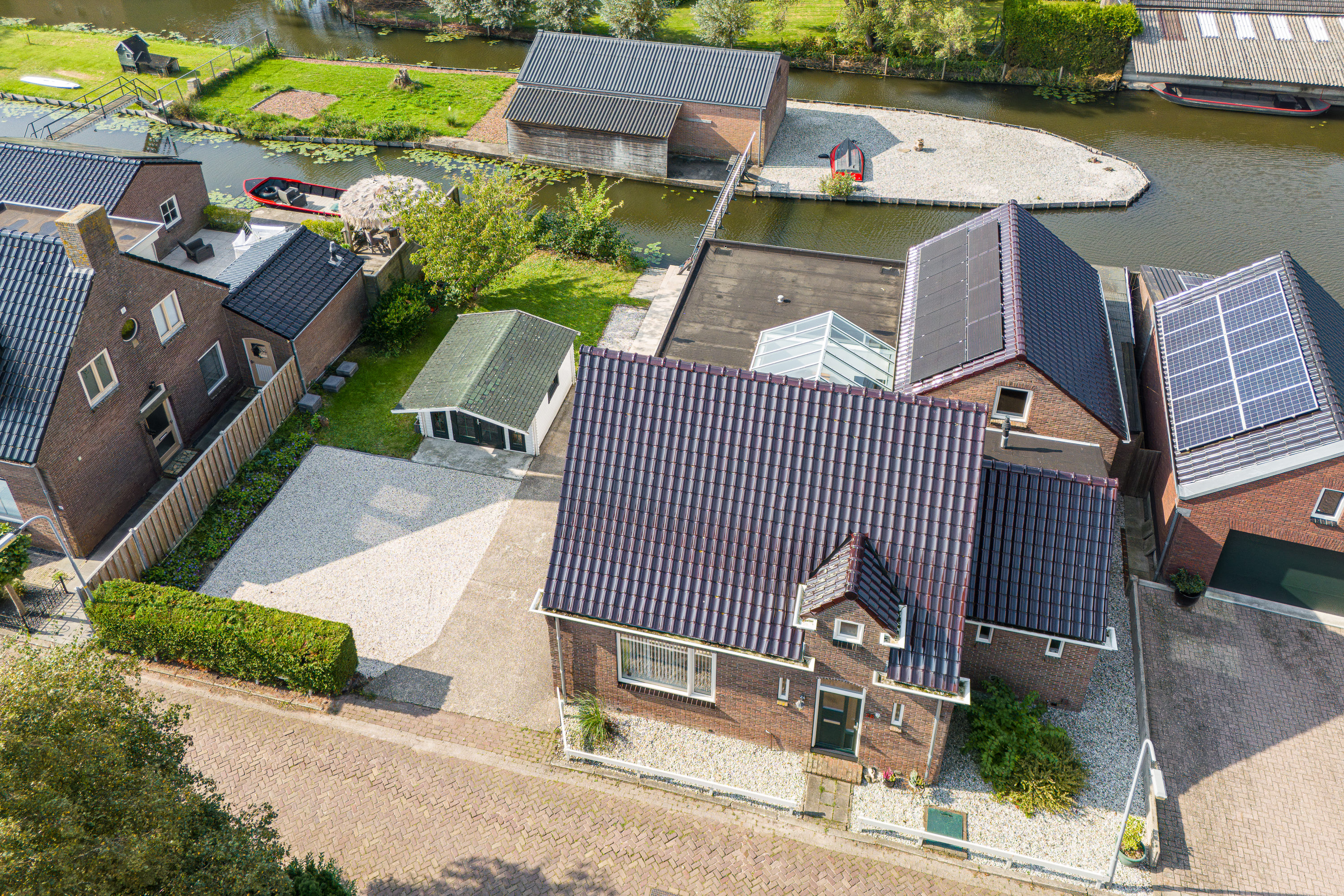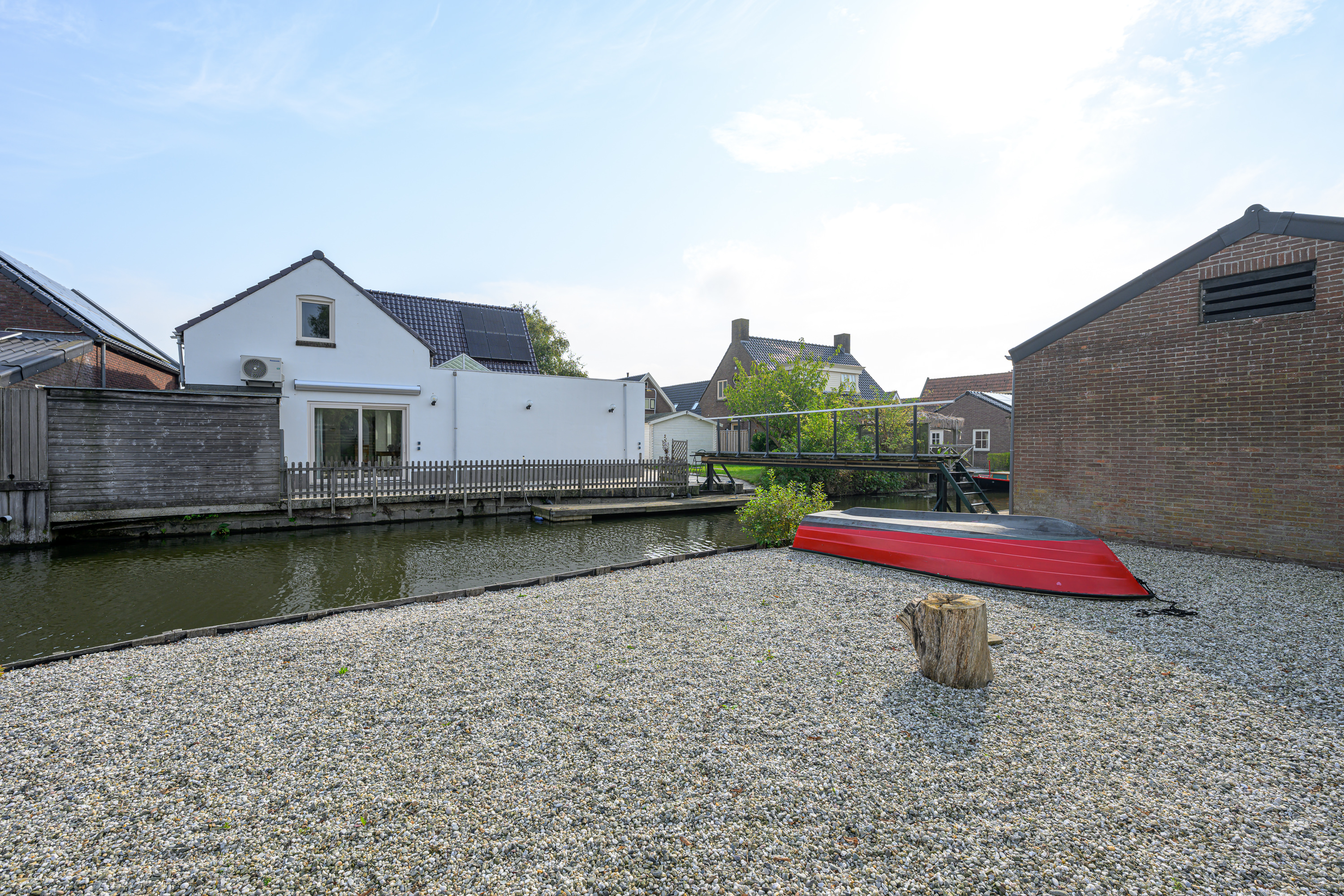 Als we door de schuifpui naar buiten gaan stappen we op het fraai aangelegen zonneterras en vinden we rechts naast de woning nog een berging waar u meerdere fietsen, uw tuin set of watersport benodigdheden kunt opbergen. De op het zuiden gelegen grote tuin is voorzien van een ruim grasveld, een houten tuinhuis/berging, deels betegelde vloer en biedt ruimte aan het parkeren van minimaal 2 auto's op eigen terrein en achterin een loopbrug naar het eiland.