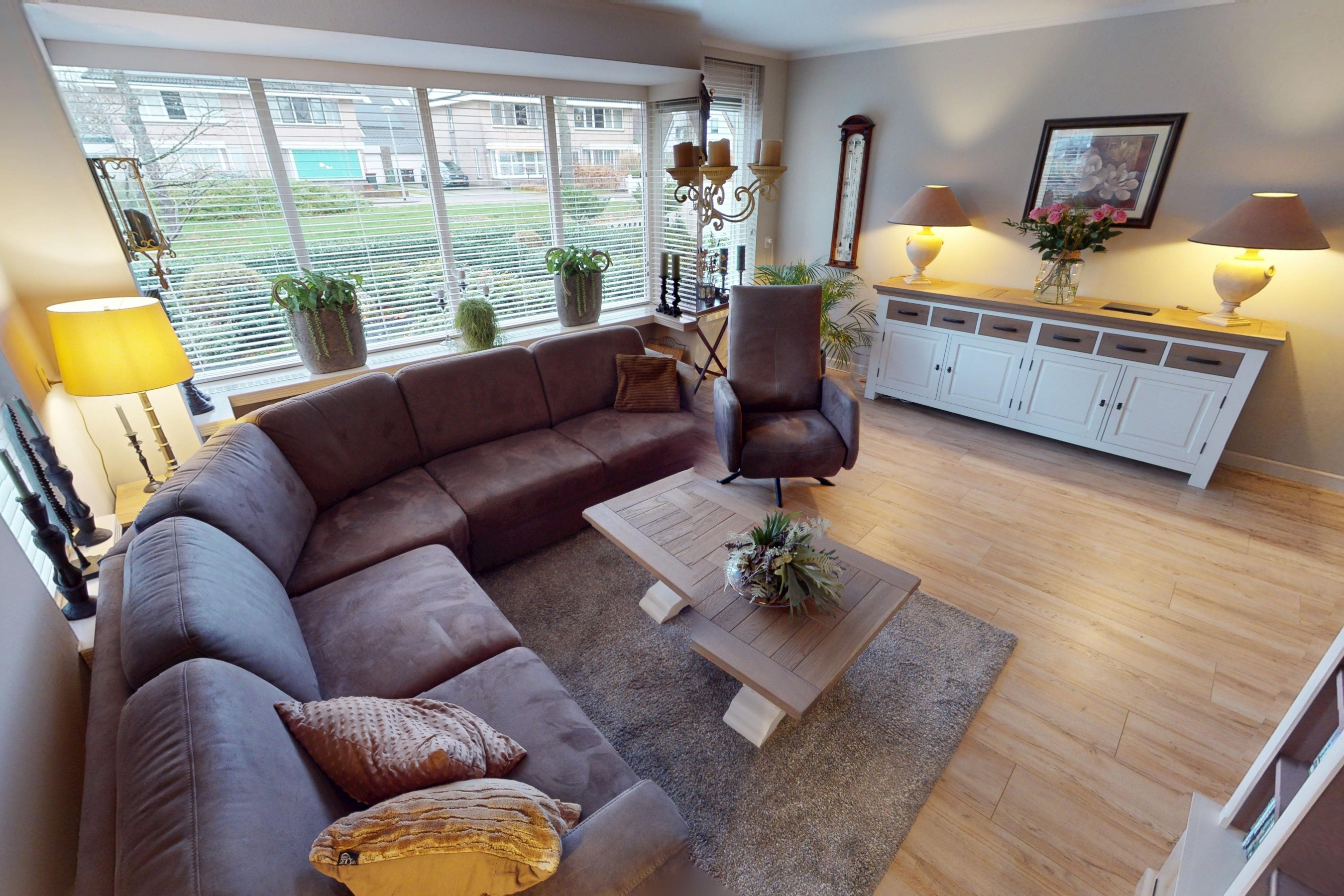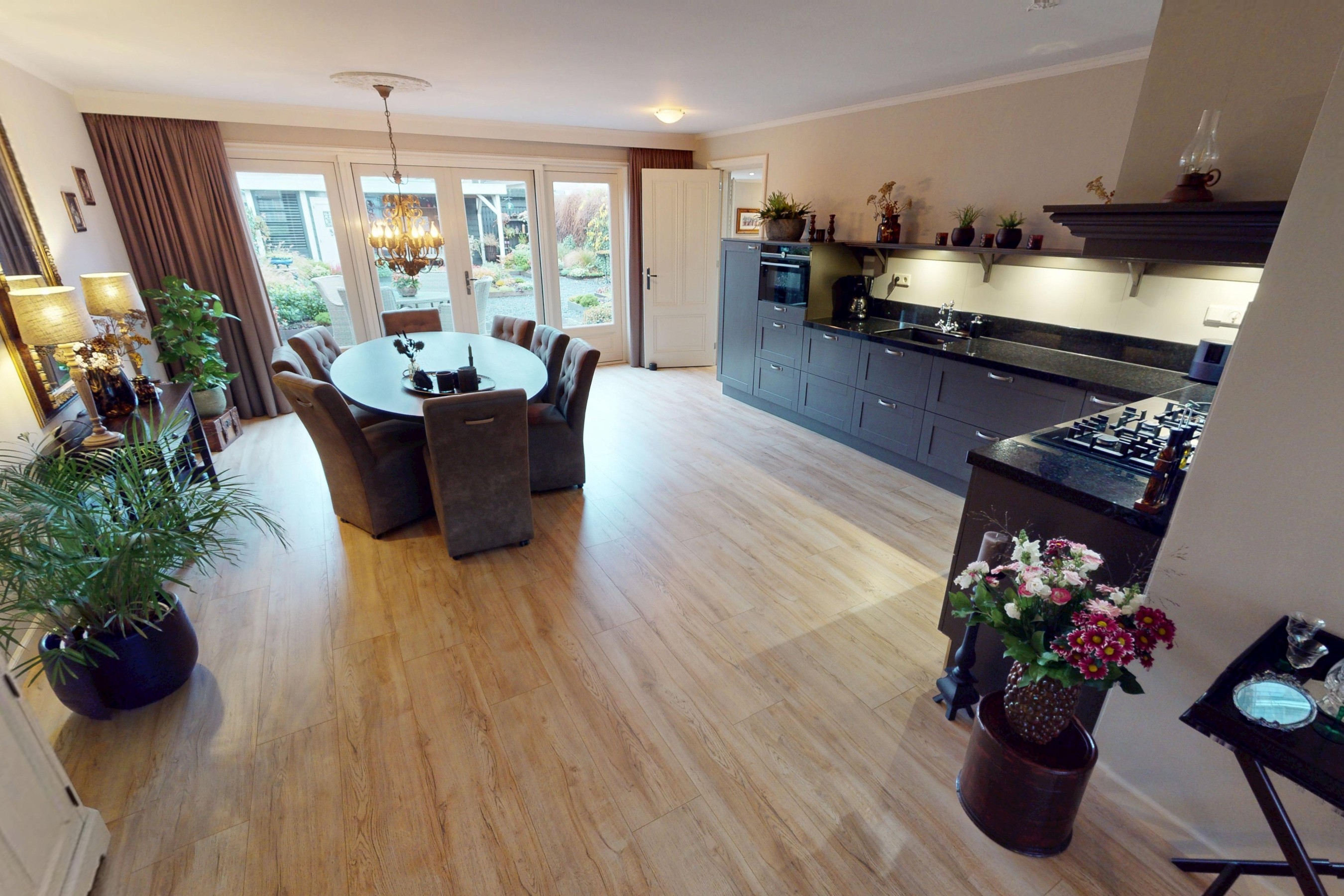 De woonkamer is door de vormgeving heerlijk praktisch. Op de gehele parterre is een laminaatvloer gelegd. Aan de voorzijde heeft u door de erker een ruime living, waar u prima een grote loungebank kunt plaatsen. Aan de achterzijde van de woning is een heerlijke woon/leefkeuken aanwezig. Vanaf uw eetkamertafel heeft fijn zicht op de fraai aangelegde tuin. Middels de openslaande tuindeuren kunt u deze mooie tuin bereiken. De wanden zijn keurig afgewerkt en het plafond is strak gestuukt en afgewerkt met plafondlijsten.