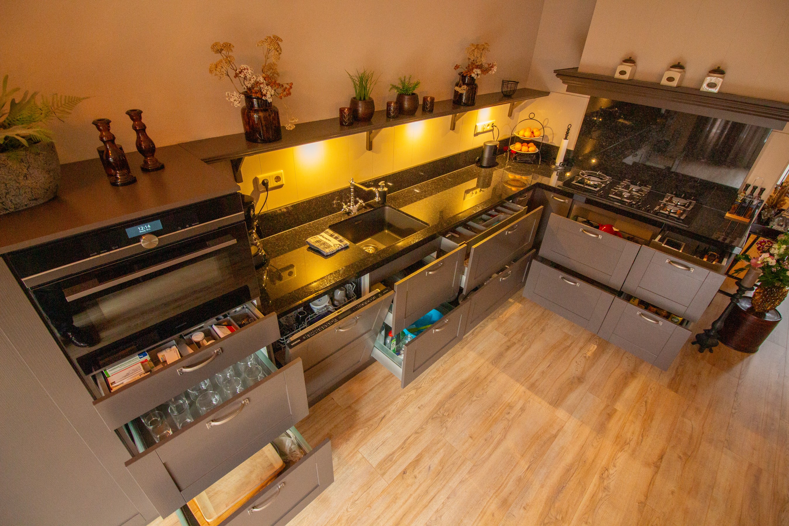 De fraaie luxe keuken is in een L-vorm geplaatst. De keuken is in een in een antraciet kleurstelling uitgevoerd en afgewerkt met een granieten werkblad. Aan inbouwapparatuur zijn naast de koelkast, een combimagnetron, 5 pits gaskookplaat, afzuigschouw, en een vaatwasser aanwezig. De brede lades zorgen voor veel opbergruimte. Het is een heerlijke plek om uw kookkunsten te etaleren. Via de keuken kunt u de ruime bijkeuken bereiken.