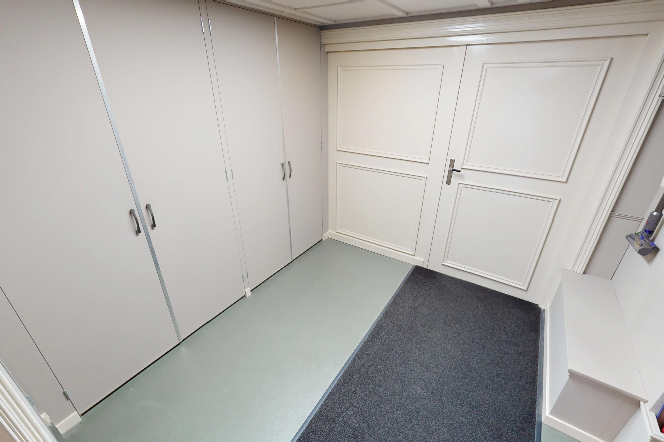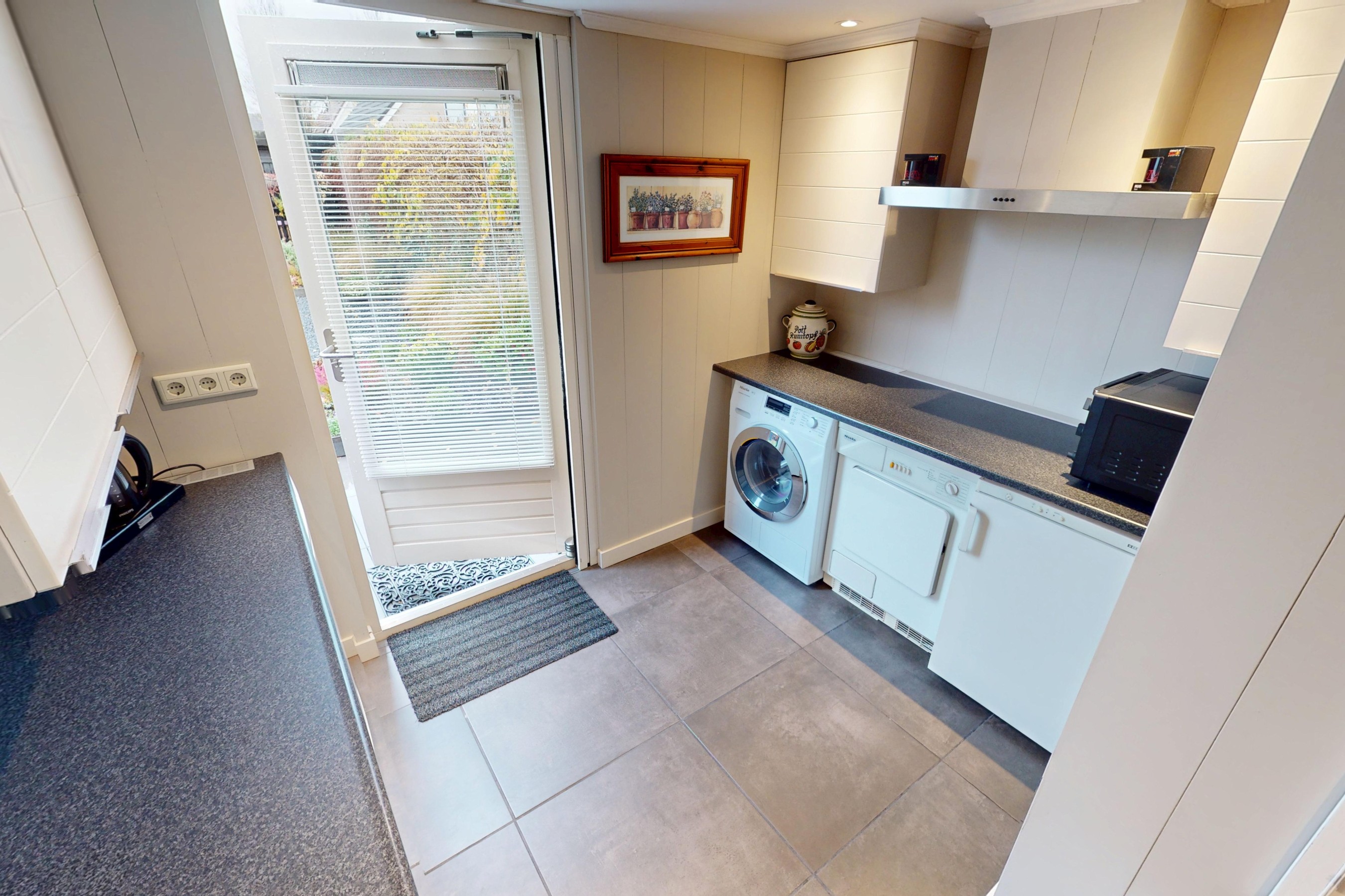 Bijkeuken: de bijkeuken is naast extra opbergruimte ook voorzien van een afzuigkap. Dat is handig als u voor oud en nieuw oliebollen wilt bakken. Bovendien treft u in deze bijkeuken de wasmachine en drogeropstelling aan. U kunt hier ook een extra koelkast en/of diepvries plaatsen. Door de aanwezigheid van werkbladen heeft u extra werkruimte tot uw beschikking. Via de bijkeuken kunt u via een openslaande tuindeur ook de tuin bereiken. De bijkeuken wordt fijn verwarmd door een design-radiator.