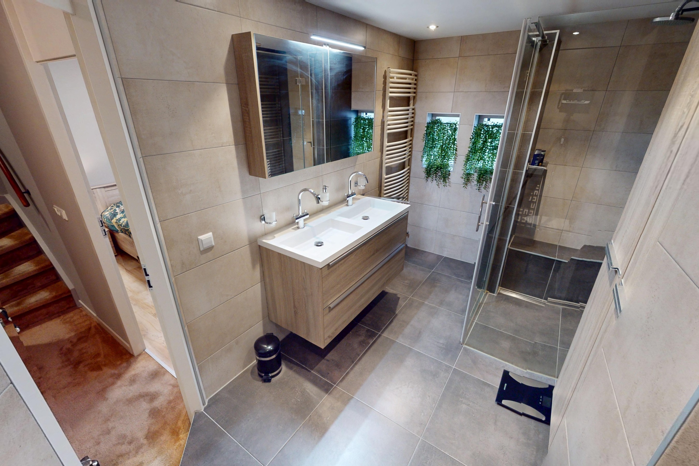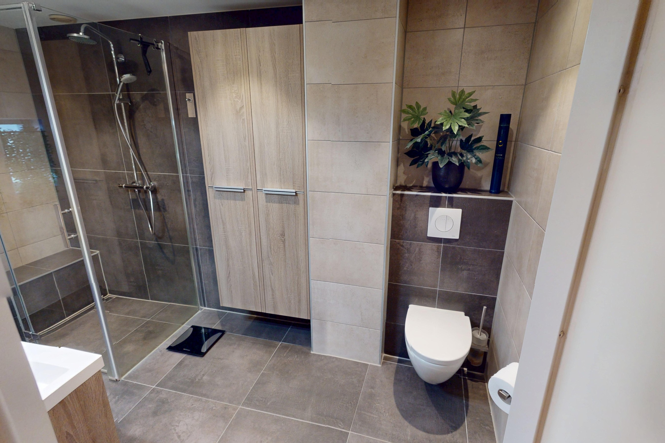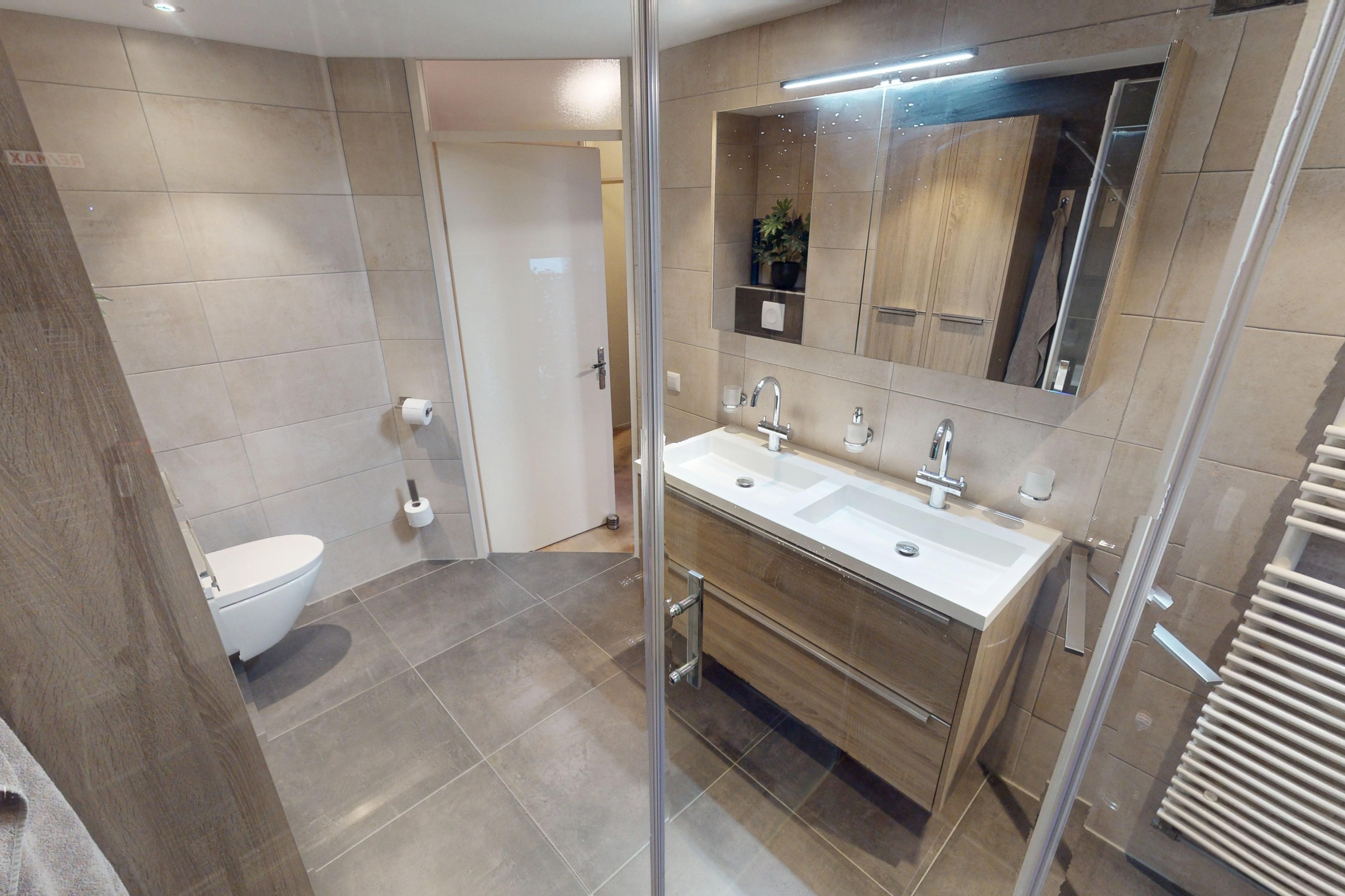 De luxe badkamer is volledig betegeld in een warme kleurstelling gecombineerd met een antraciet grijze vloer. In de badkamer vindt u een wastafelmeubel met dubbele spoelbak, hangcloset en een ruime douchegelegenheid met stortdouche en handdouche aan. In de handige kast kunt u prima uw handdoeken een plaatsje geven of uw toiletartikelen opbergen. Uiteraard is de badkamer voorzien van een design-radiator.