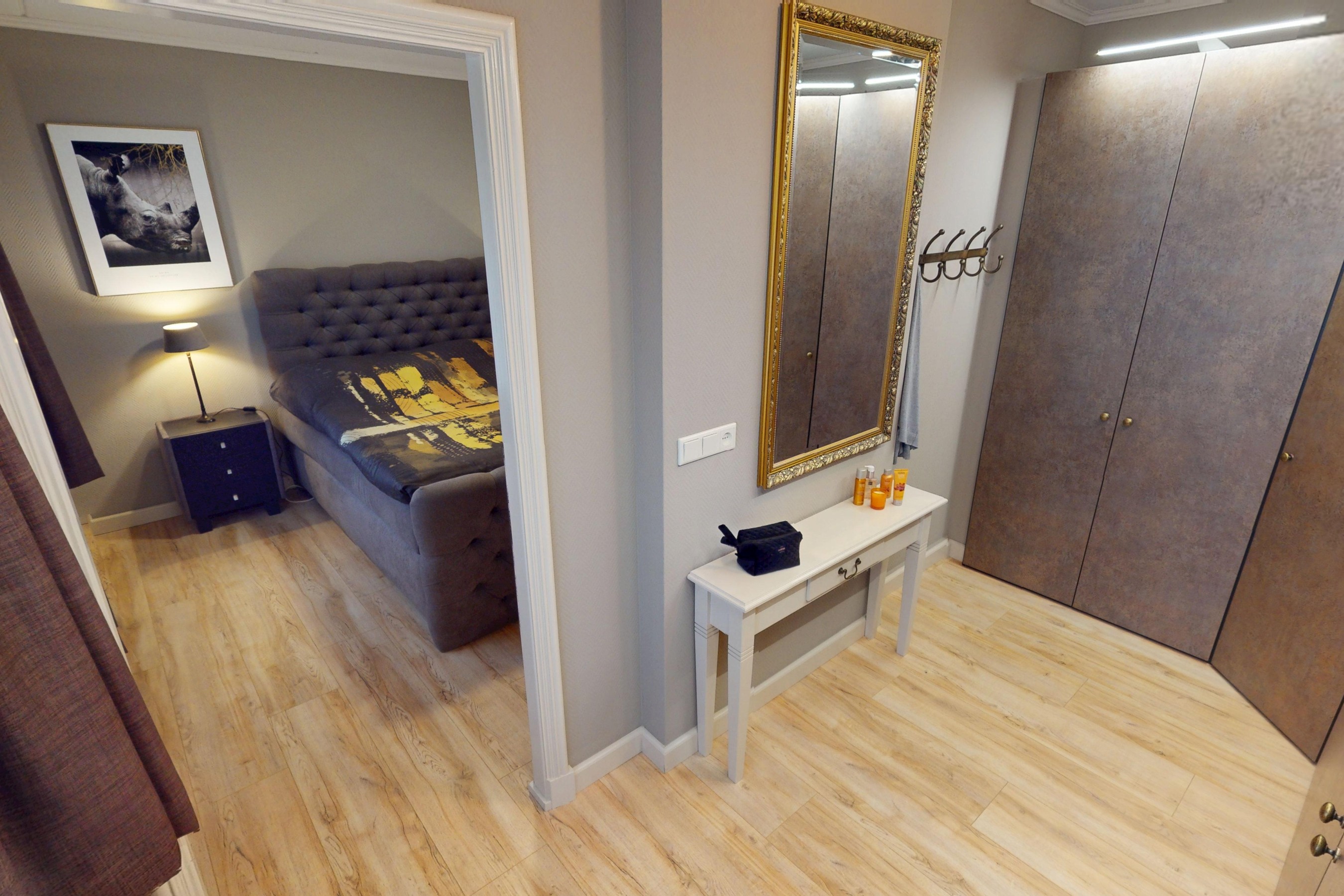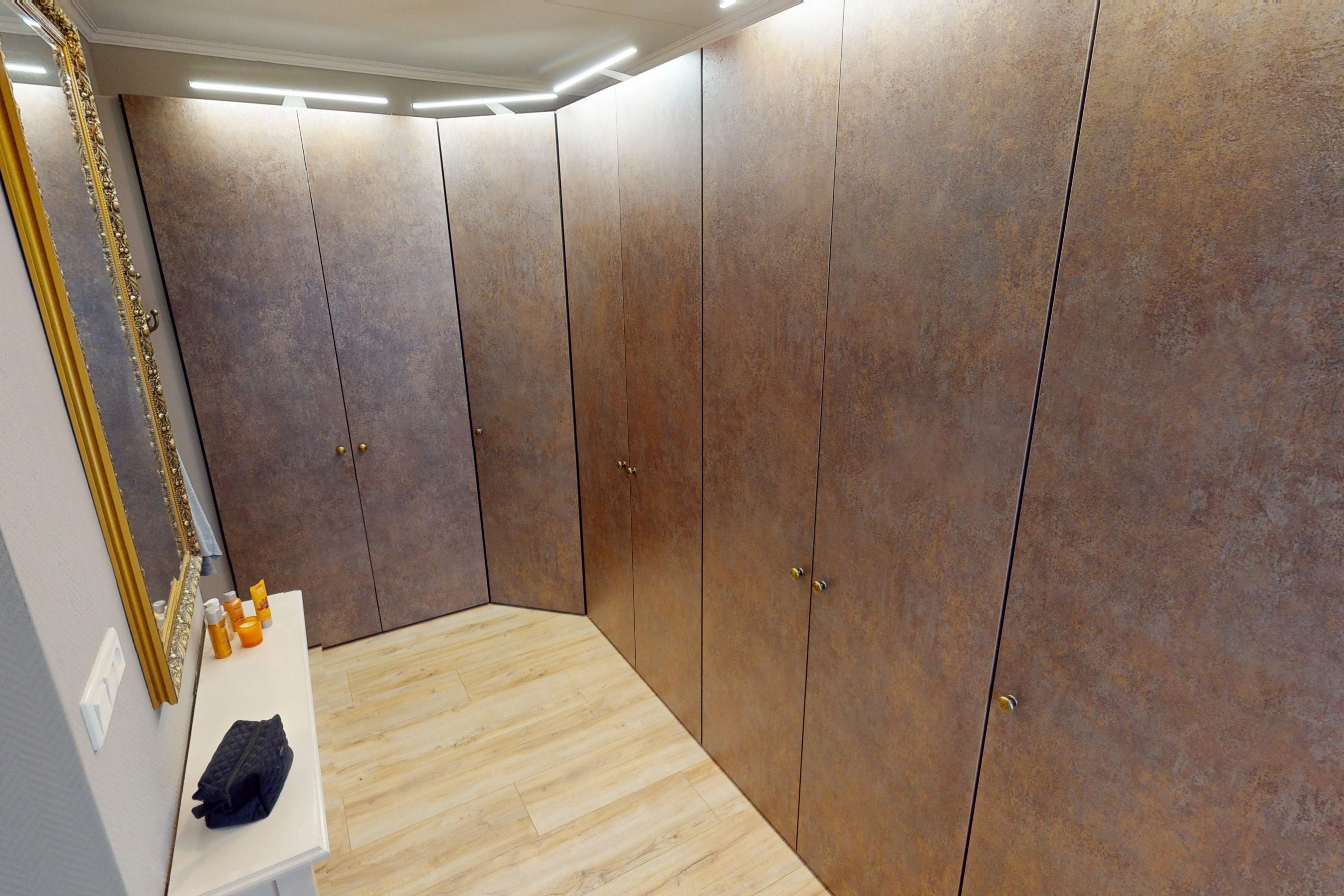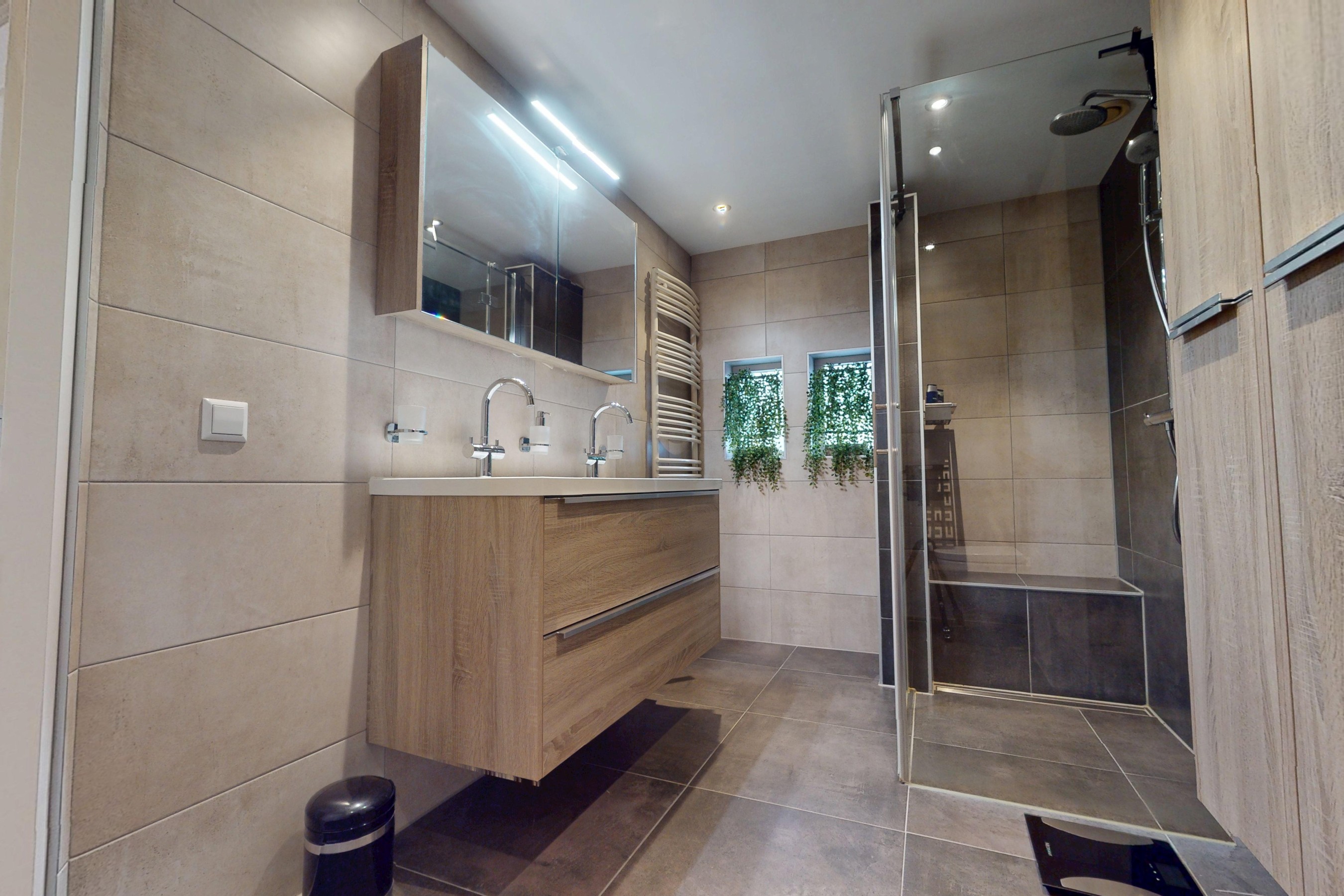 De luxe badkamer is volledig betegeld in een warme kleurstelling gecombineerd met een antraciet grijze vloer. In de badkamer vindt u een wastafelmeubel met dubbele spoelbak, hangcloset en een ruime douchegelegenheid met stortdouche en handdouche aan. In de handige kast kunt u prima uw handdoeken een plaatsje geven of uw toiletartikelen opbergen. Uiteraard is de badkamer voorzien van een design-radiator.