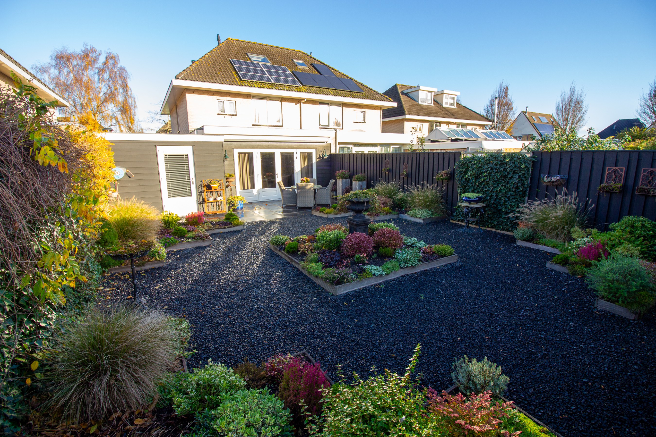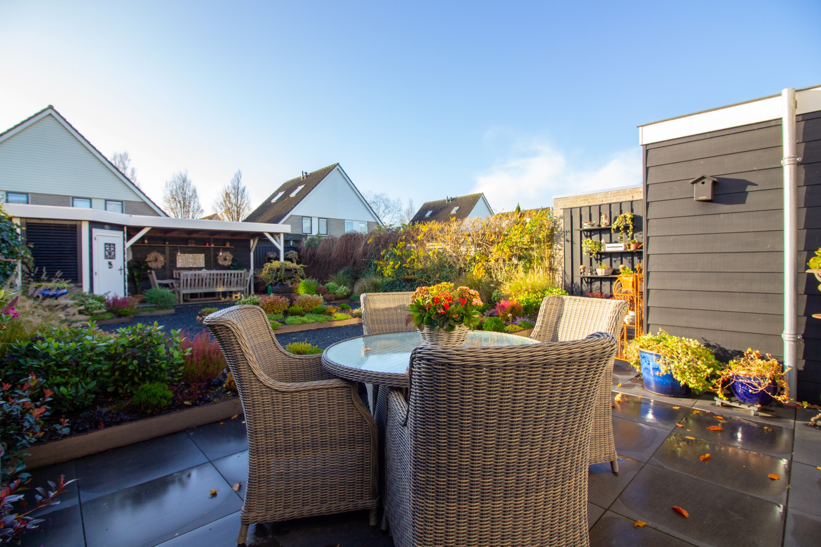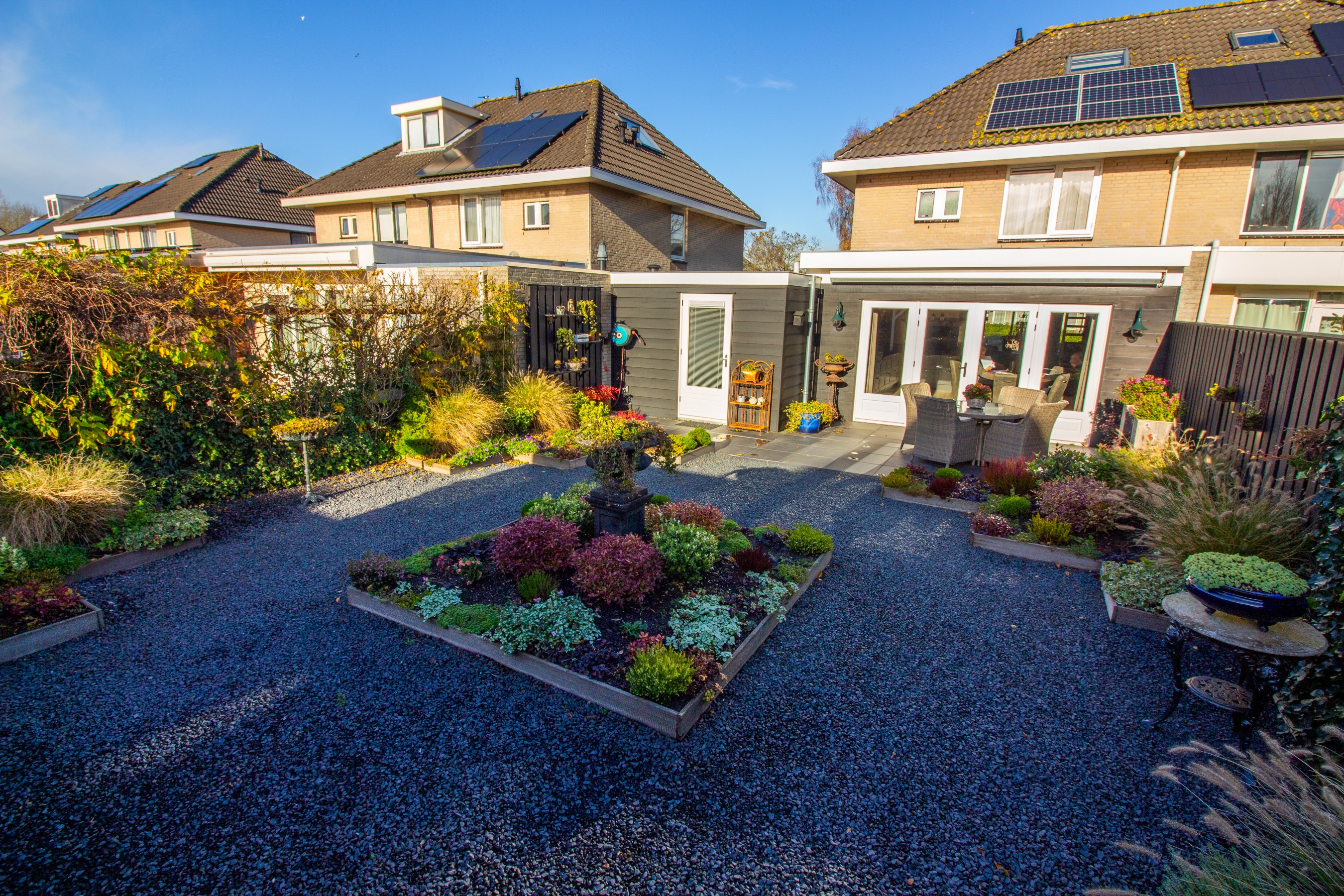 Tuin: een sierlijke, brede tuin met een zalige zuiden zonligging. Dit betekent dat u de gehele dag de zon in de tuin heeft staan! Door de verschillende terrassen in de tuin kunt u ook optimaal genieten van deze fraai aangelegde tuin. De tuin heeft diverse borders met een diversiteit aan beplantingen. Dit geldt uiteraard ook voor de vrijstaande veranda achter in de tuin. Een heerlijke loungeplek! U heeft hier eveneens opbergruimte voor uw tuinmeubelen. Voor enige schaduw is ook gezorgd. Aan de achterzijde van de woning bevindt zich heerlijk een zonnescherm.