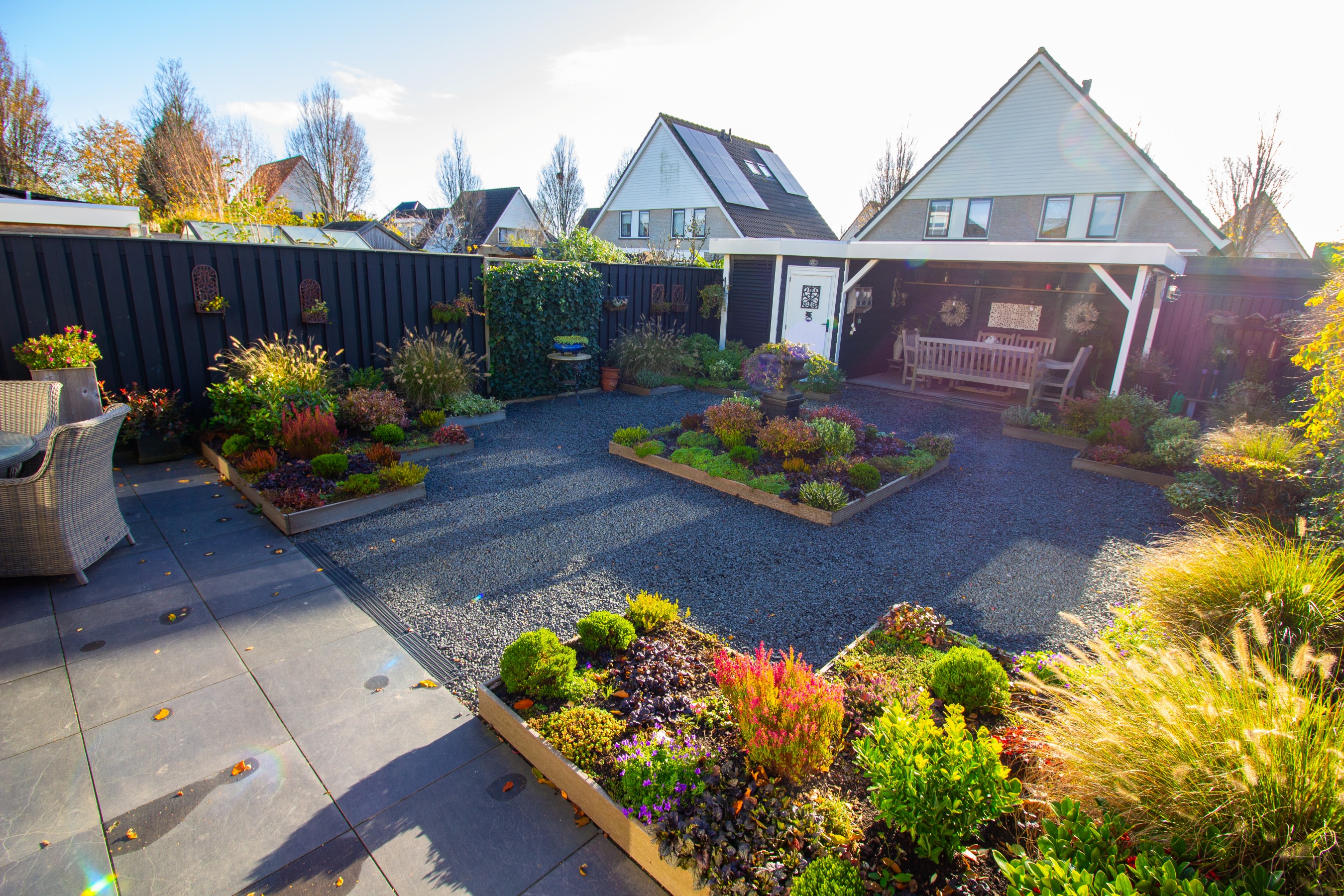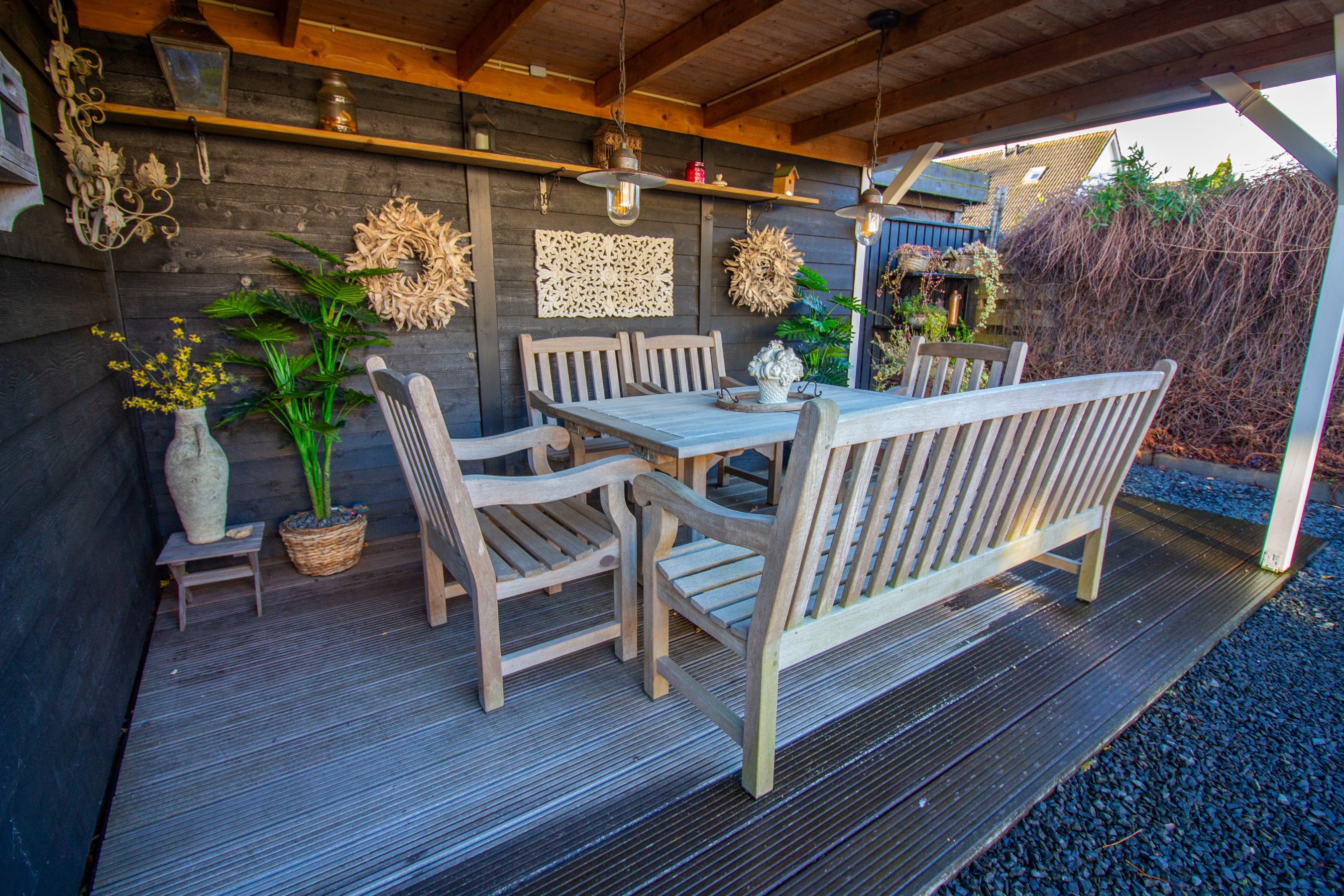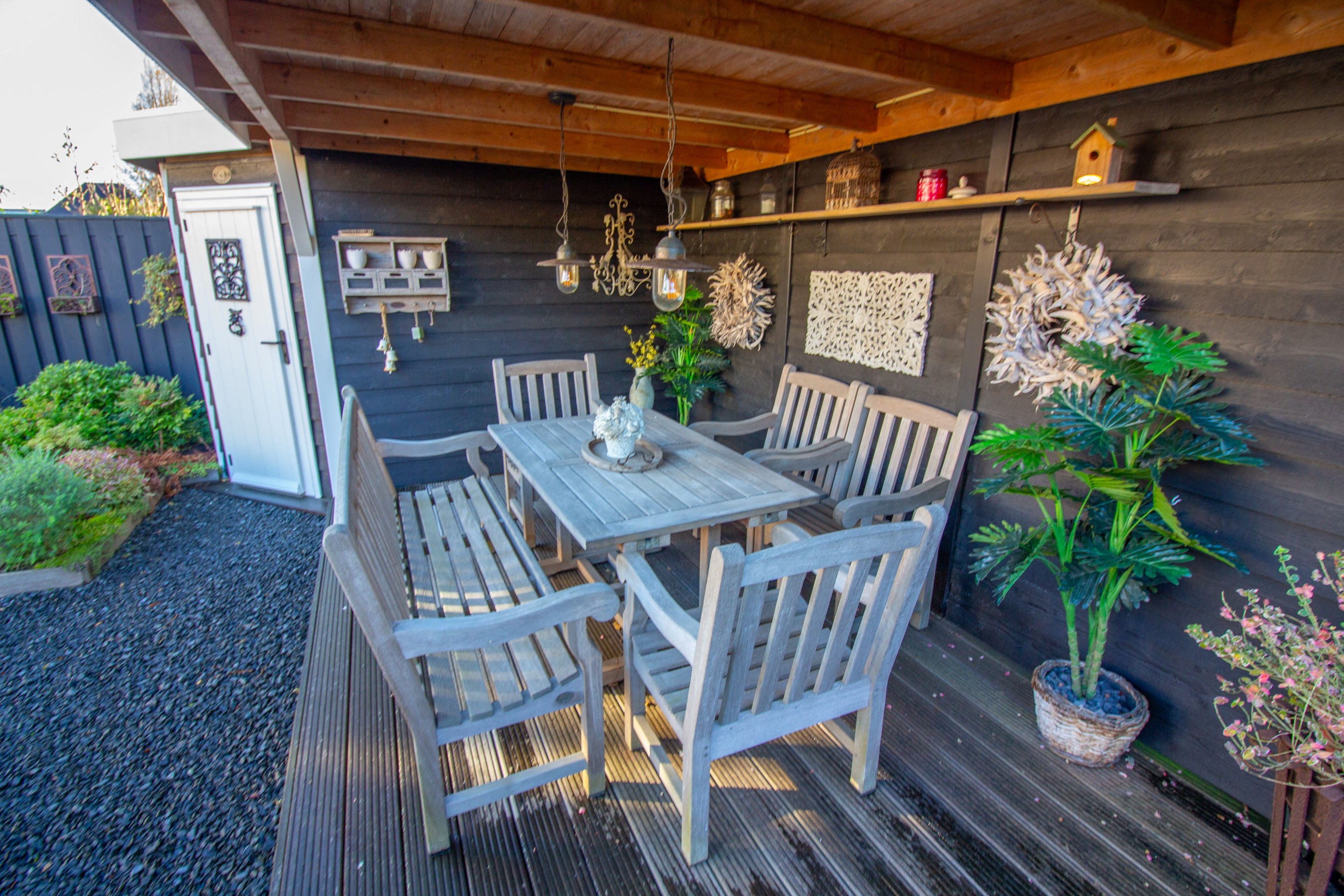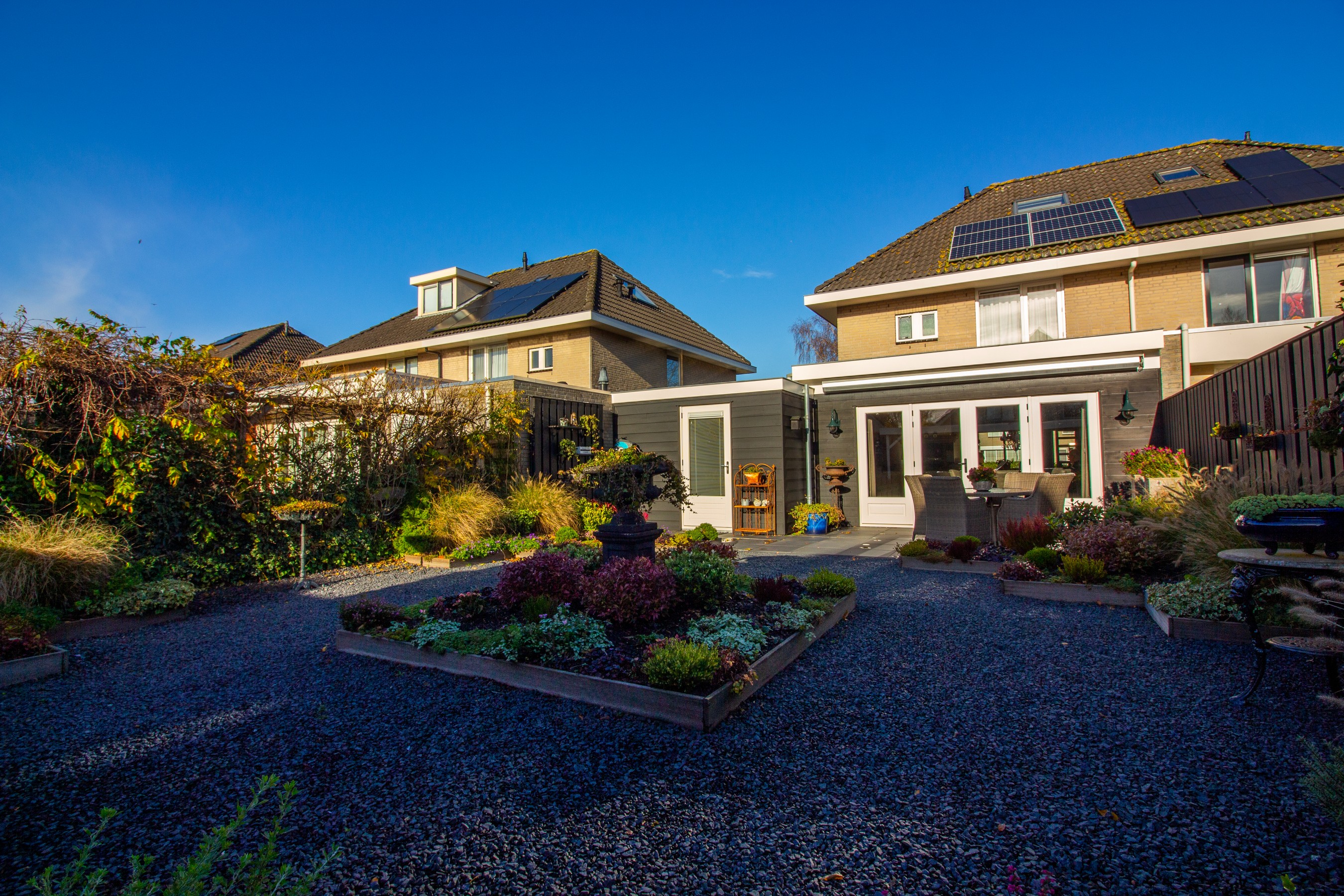 Tuin: een sierlijke, brede tuin met een zalige zuiden zonligging. Dit betekent dat u de gehele dag de zon in de tuin heeft staan! Door de verschillende terrassen in de tuin kunt u ook optimaal genieten van deze fraai aangelegde tuin. De tuin heeft diverse borders met een diversiteit aan beplantingen. Dit geldt uiteraard ook voor de vrijstaande veranda achter in de tuin. Een heerlijke loungeplek! U heeft hier eveneens opbergruimte voor uw tuinmeubelen. Voor enige schaduw is ook gezorgd. Aan de achterzijde van de woning bevindt zich heerlijk een zonnescherm.